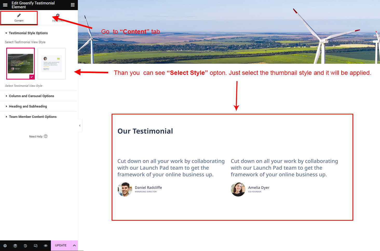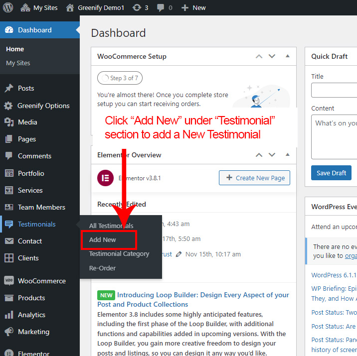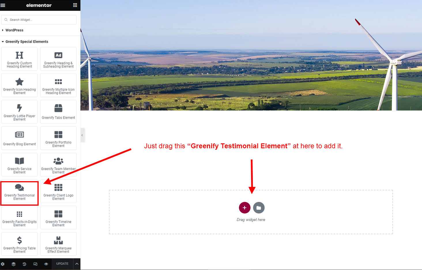 Now we have some Testimonial posts. So we can show all Testimonial on a page. Create a new page and add Greenify Testimonial Element on a page by dragging it.
