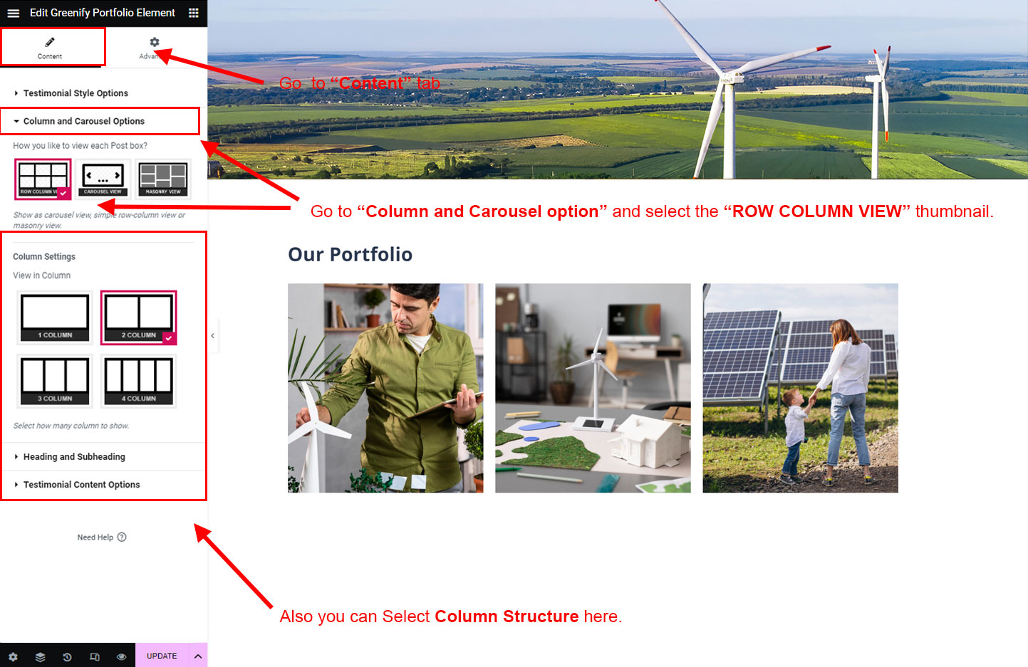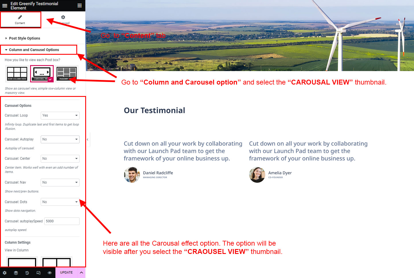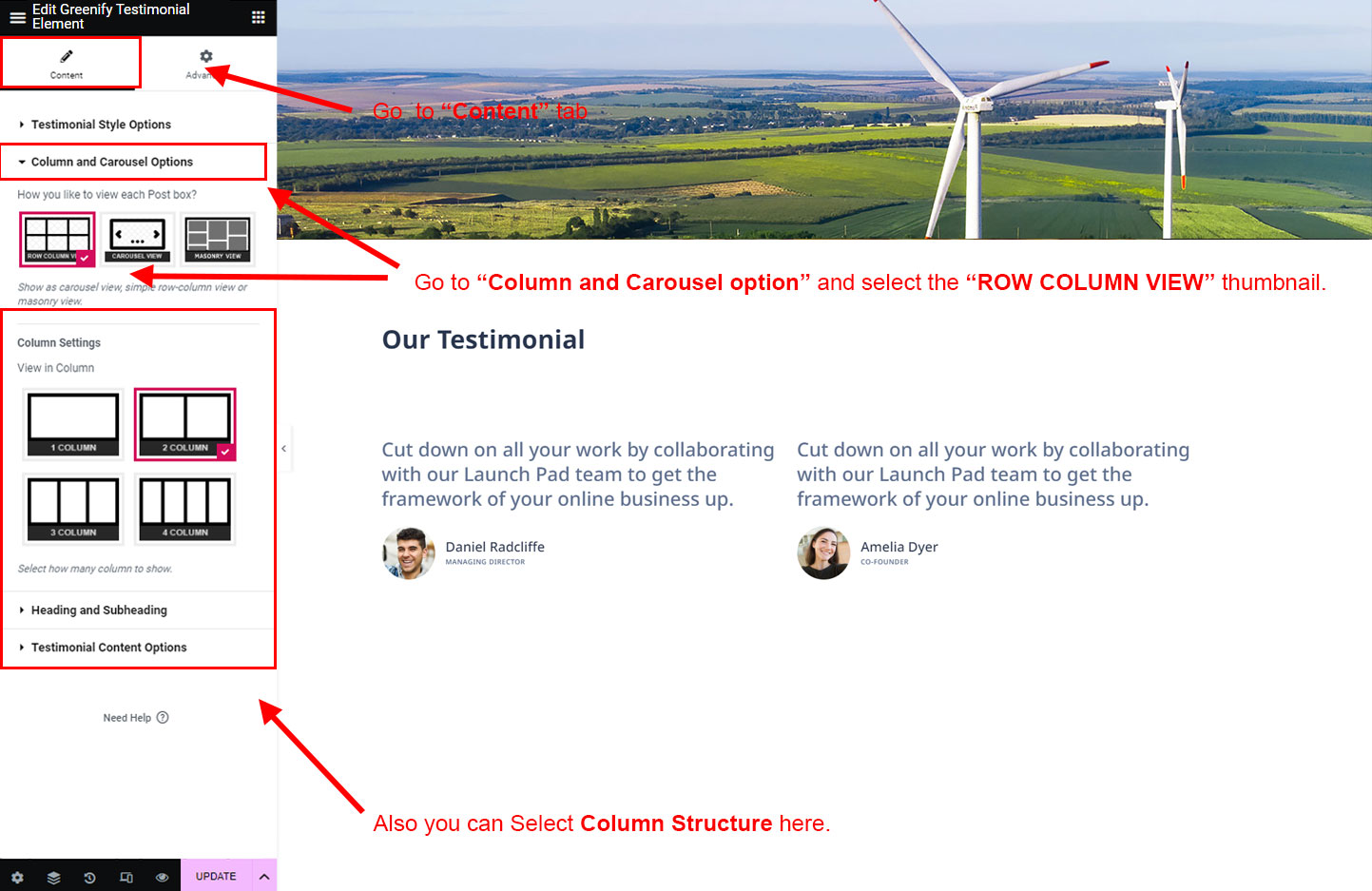 Now we have some Testimonial posts. So we can show all Testimonial on a page. Create a new page and add Greenify Testimonial Element on a page by dragging it.