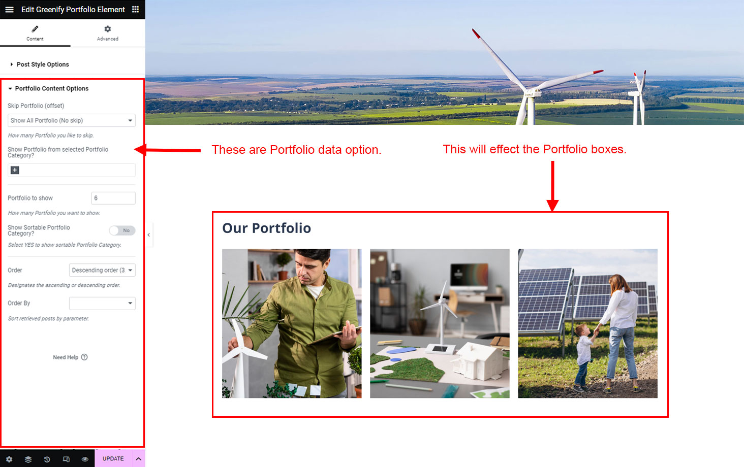 You can select the portfolio options here. Like how many portfolio you like to show, show portfolio from selected category, portfolio order etc.