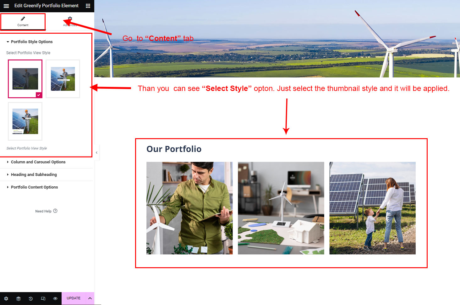 Now we have some Portfolio posts. So we can show all Portfolio on a page. Create a new page and add Greenify Portfolio Element on a page by dragging it.