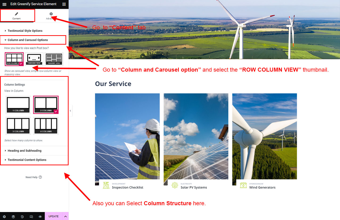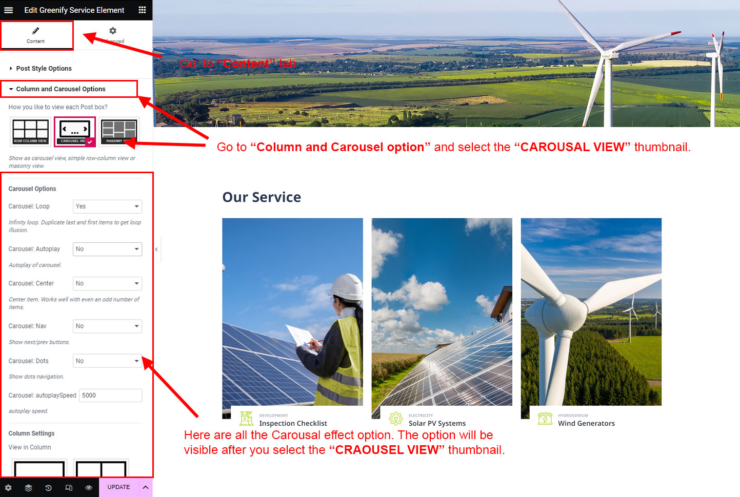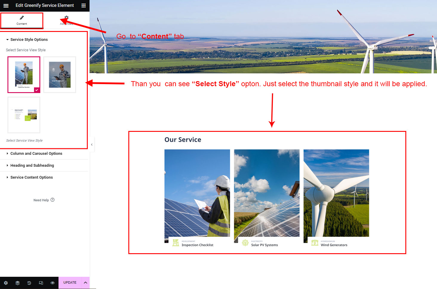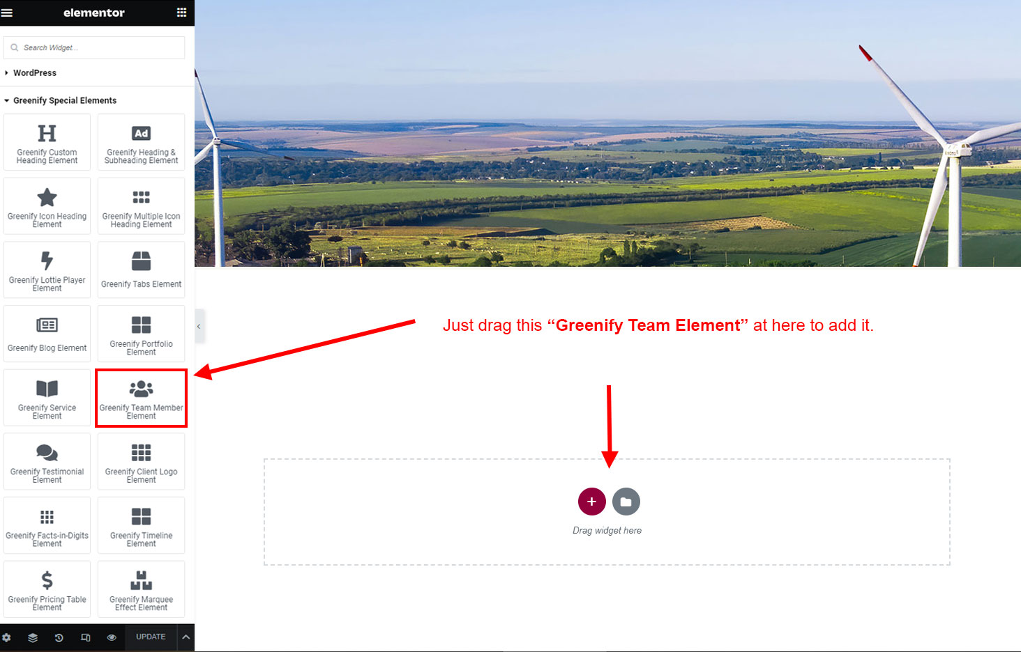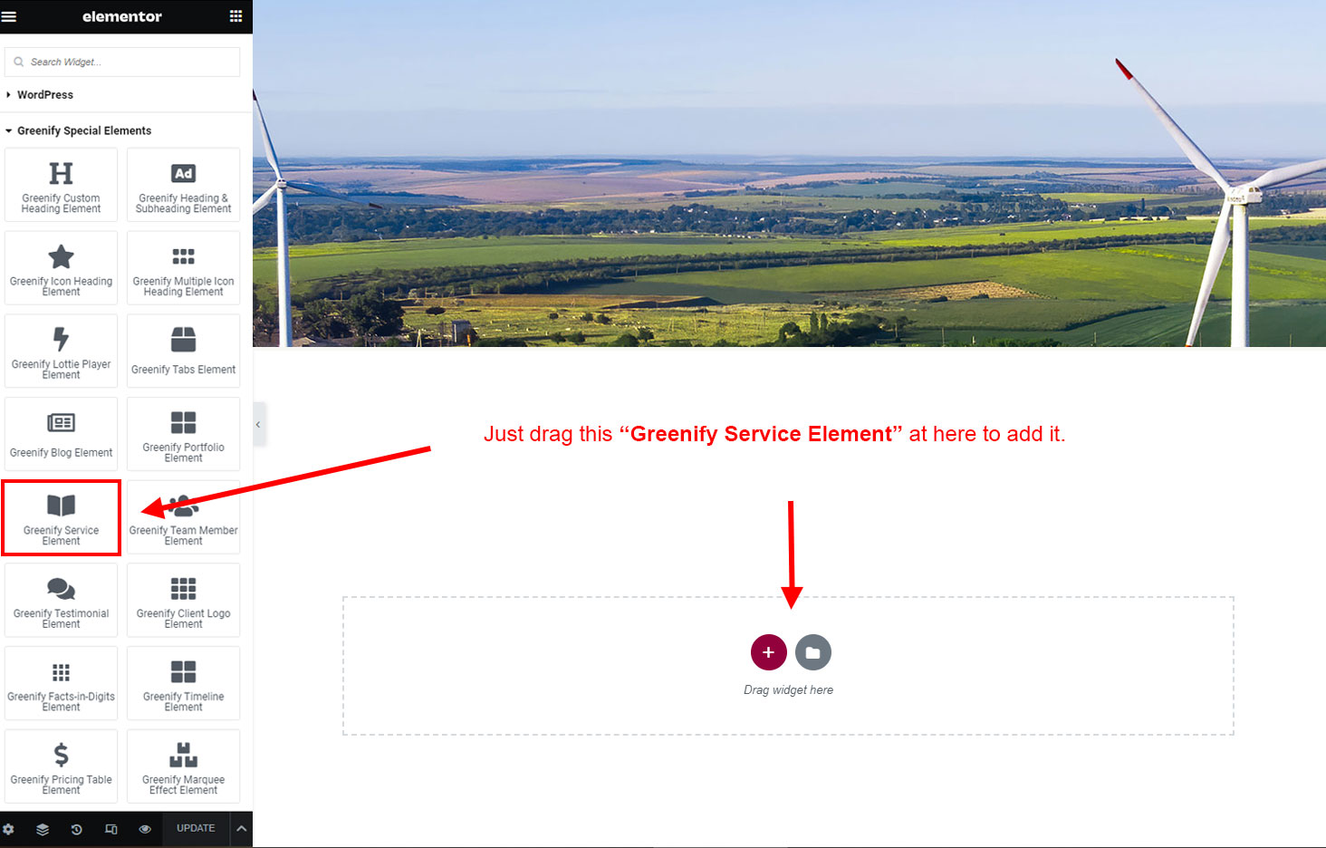 Now we have some Service posts. So we can show all Service on a page. Create a new page and add Greenify Service Element on a page by dragging it.