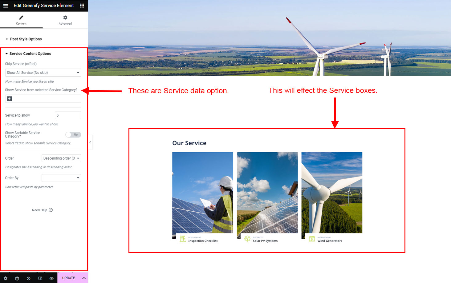 You can select the service options here. Like how many service you like to show, show service from selected category, service order etc.