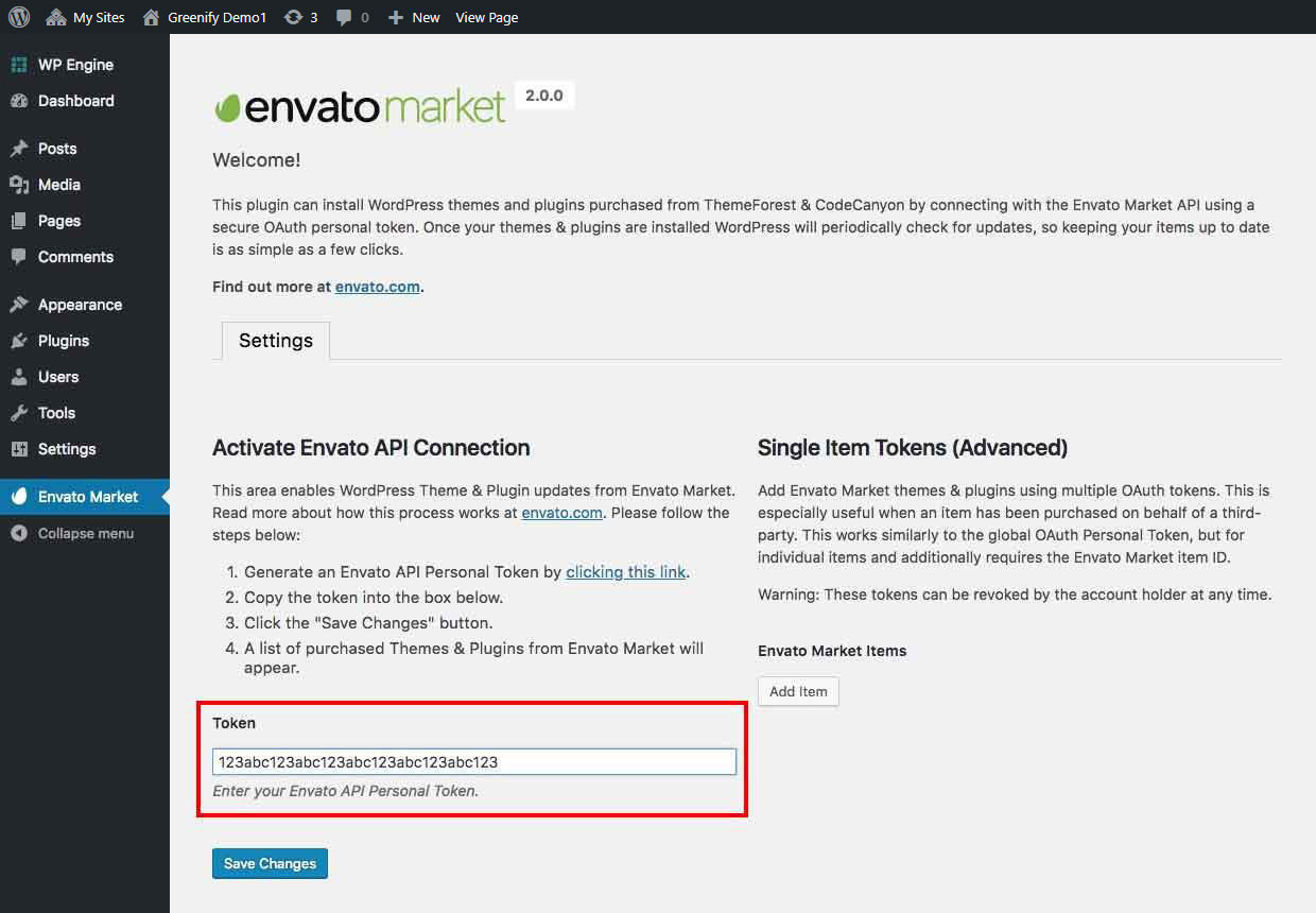 Now go back to your WordPress installation and paste in your Envato API token then click save.