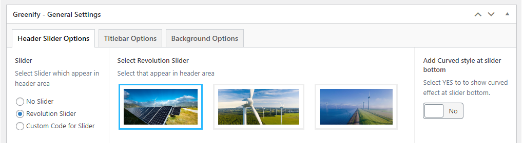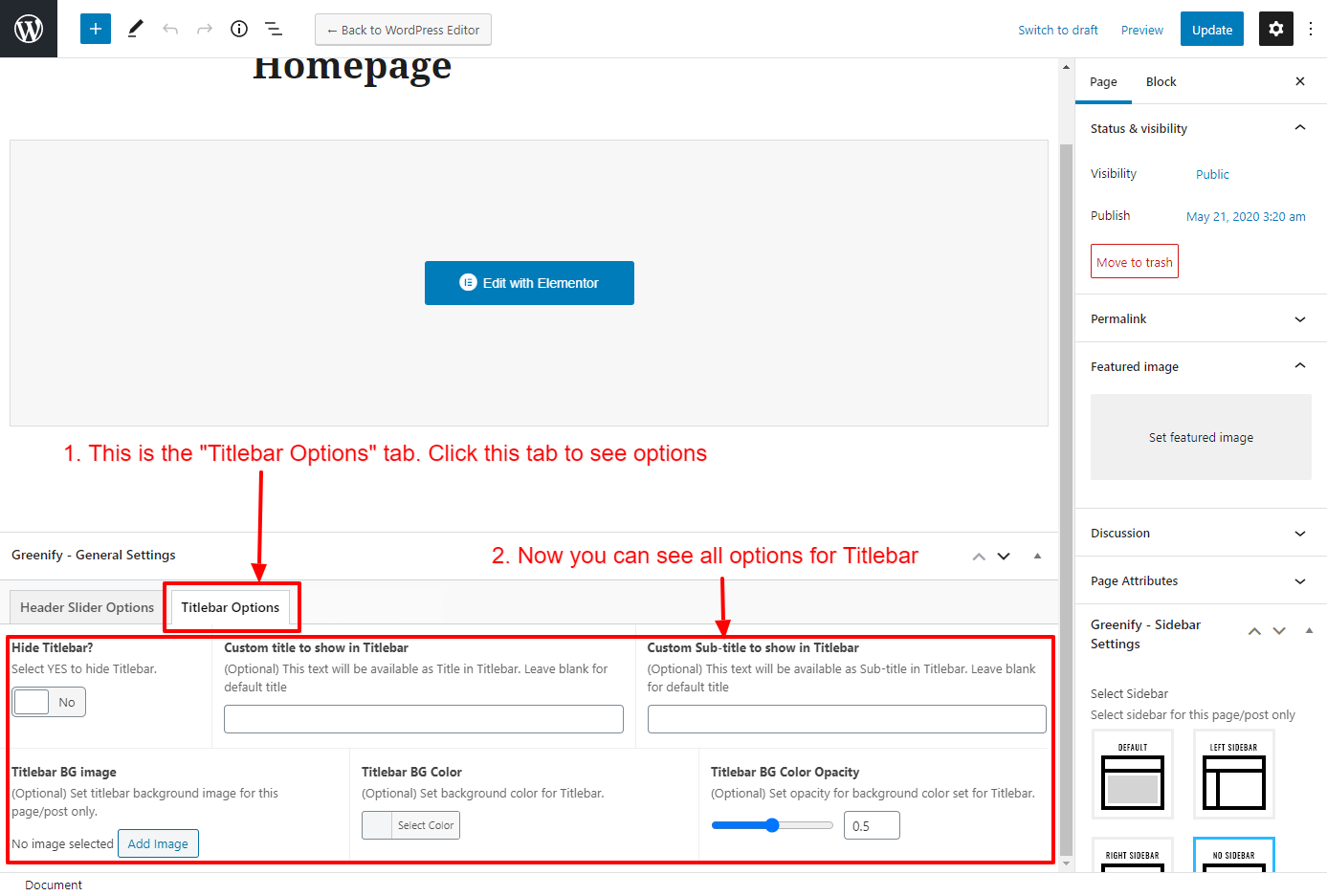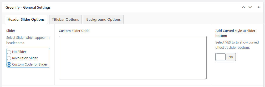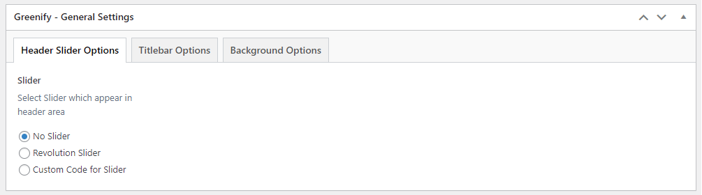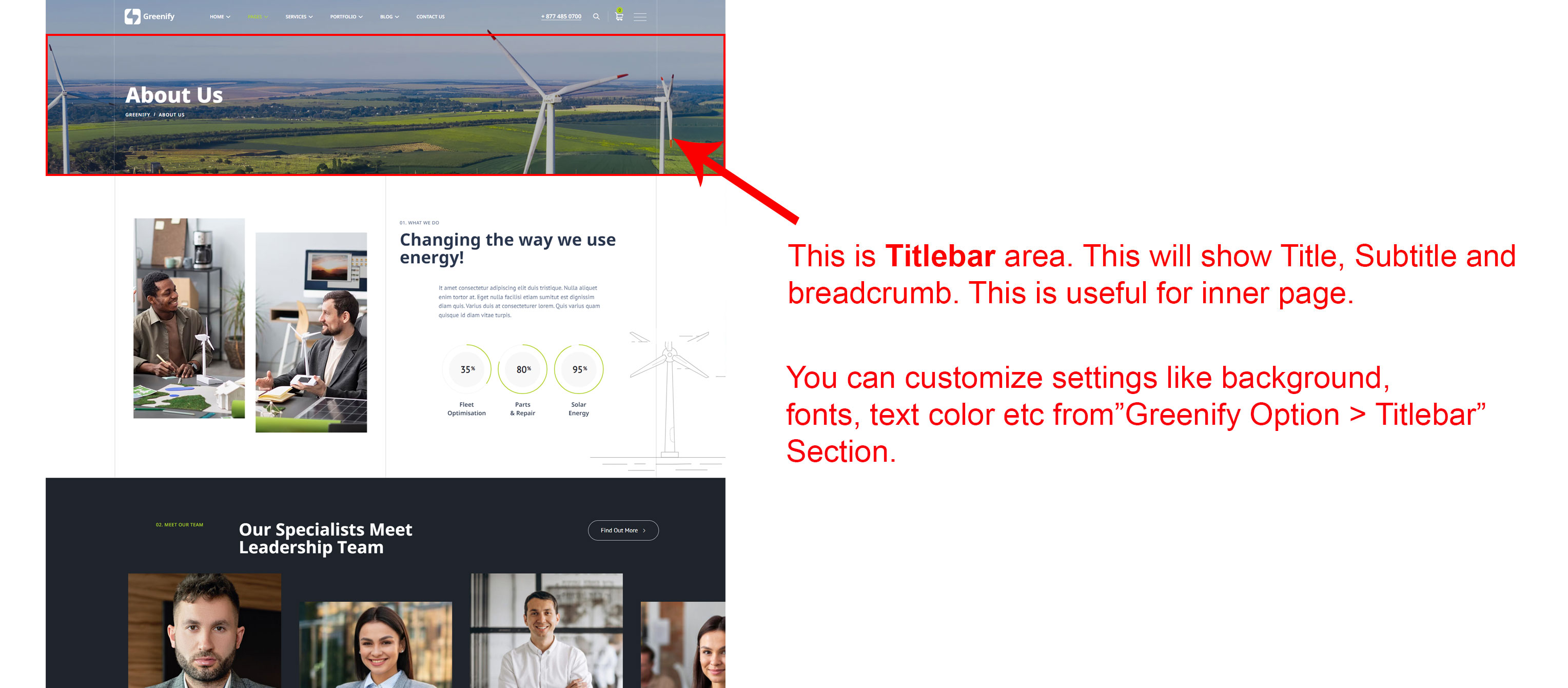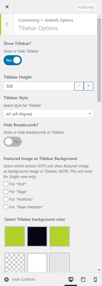 This will override the options set under Greenify Options > Titlebar Settings options. This will help you to set special design the Titlebar on specific page or post.