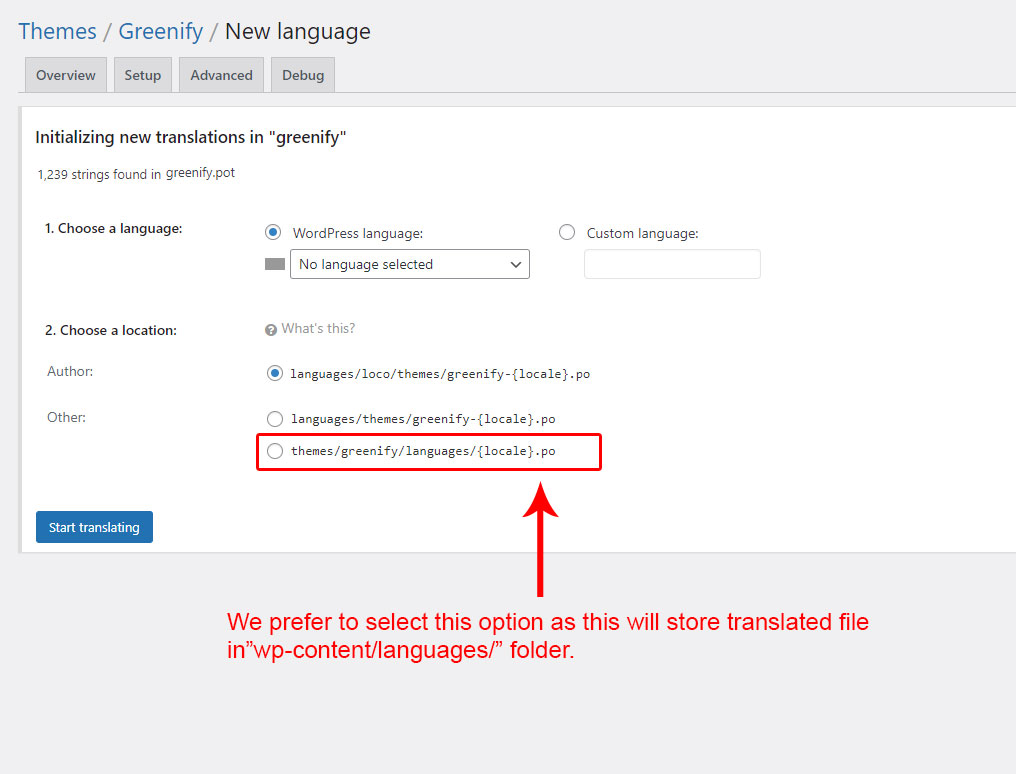 5. Now select the new language. Also make sure you select the last option (the languages/themes/file.po option) so it will store file in "wp-content" folder.