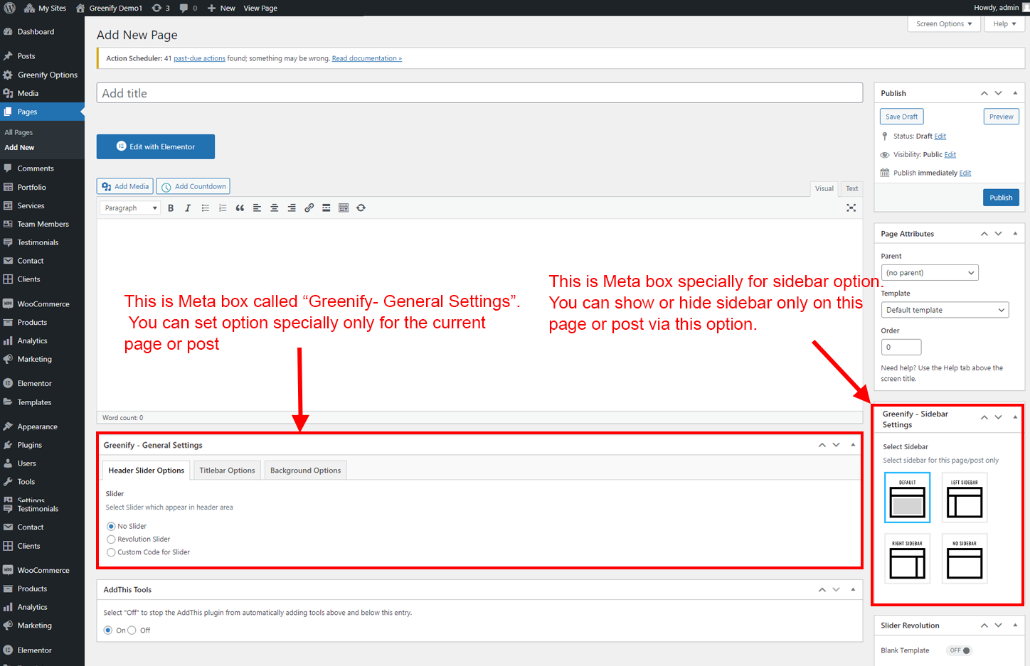 Meta box are special options that will apply to current page or post only. So you can set special view of a page or post. See above image for the Metabox example.