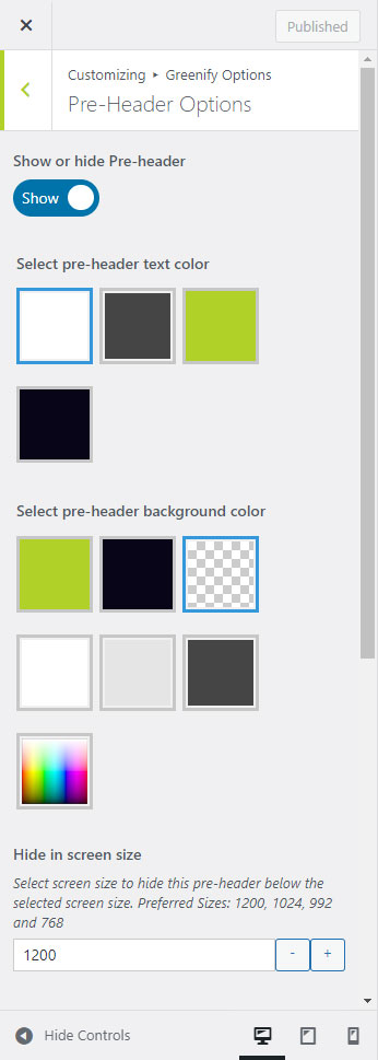 Pre-header section will appear above header area. You can show or hide it globally from Greenify Options >> Pre-header Settings section.