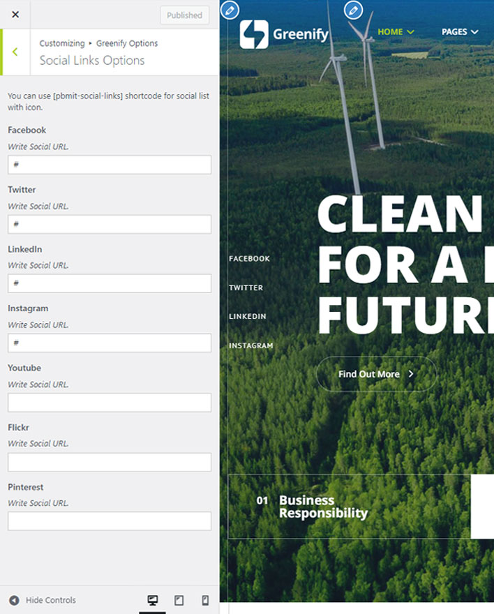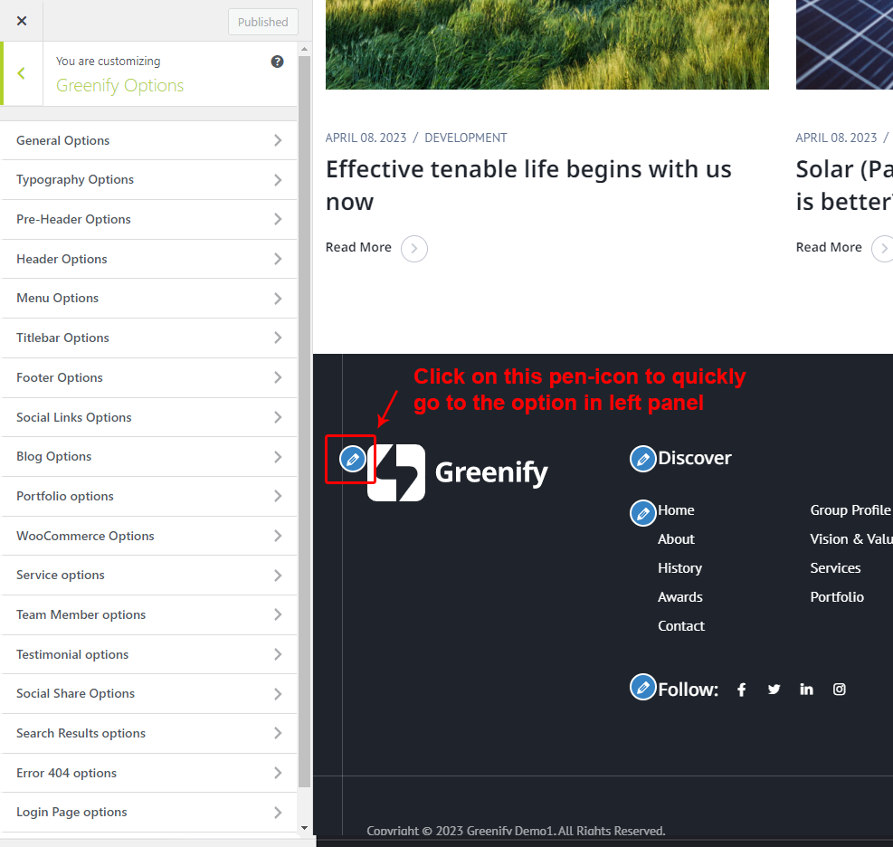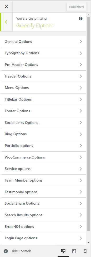 Greenify Options (Theme Options) panel is created with WordPress' Customize section. We added our own options with WordPress' default options.