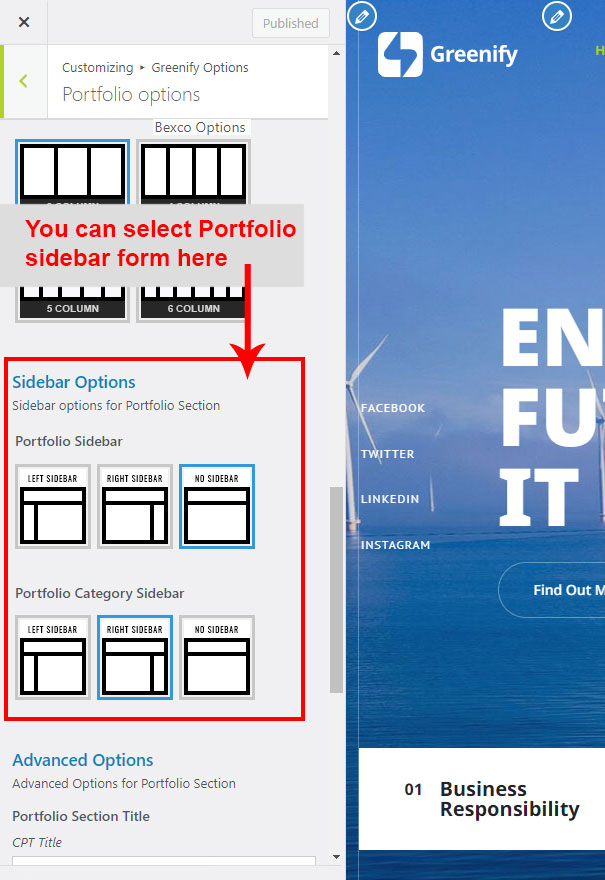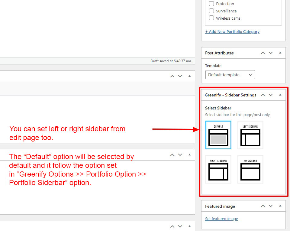 This is specially created sidebar postion for Portfolio Category view only. You can select sidebar view (left or right) in Greenify Options >> Portfolio Options section. Also you can show Portfolio Category without sidebar too.