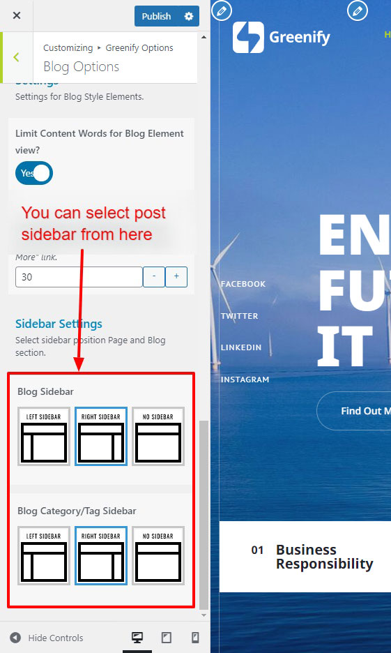 This is specially created sidebar postion (either left or right as selected in Greenify Options section) that will be shown as sidebar widget on Blog pages like blog list view, single post view, blog category view etc.