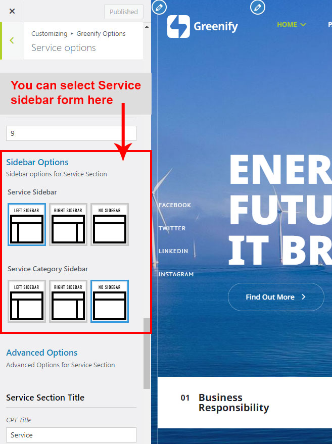This is specially created sidebar postion for Service single view only. You can select sidebar view (left or right) in Greenify Options >> Service Options section. Also you can show single Service without sidebar too.