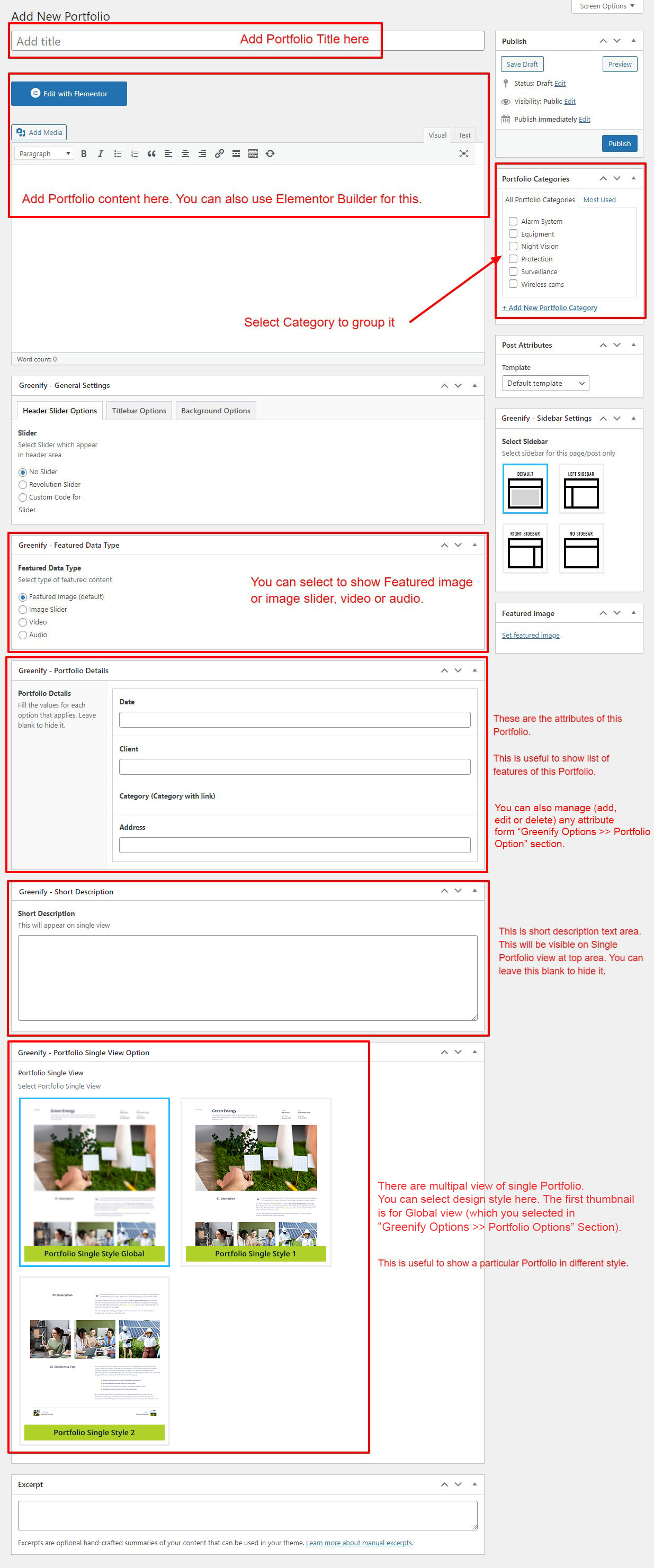 If you already done demo content setup than you can edit existing portfolio and check how we added data so you can understand each option perfectly.