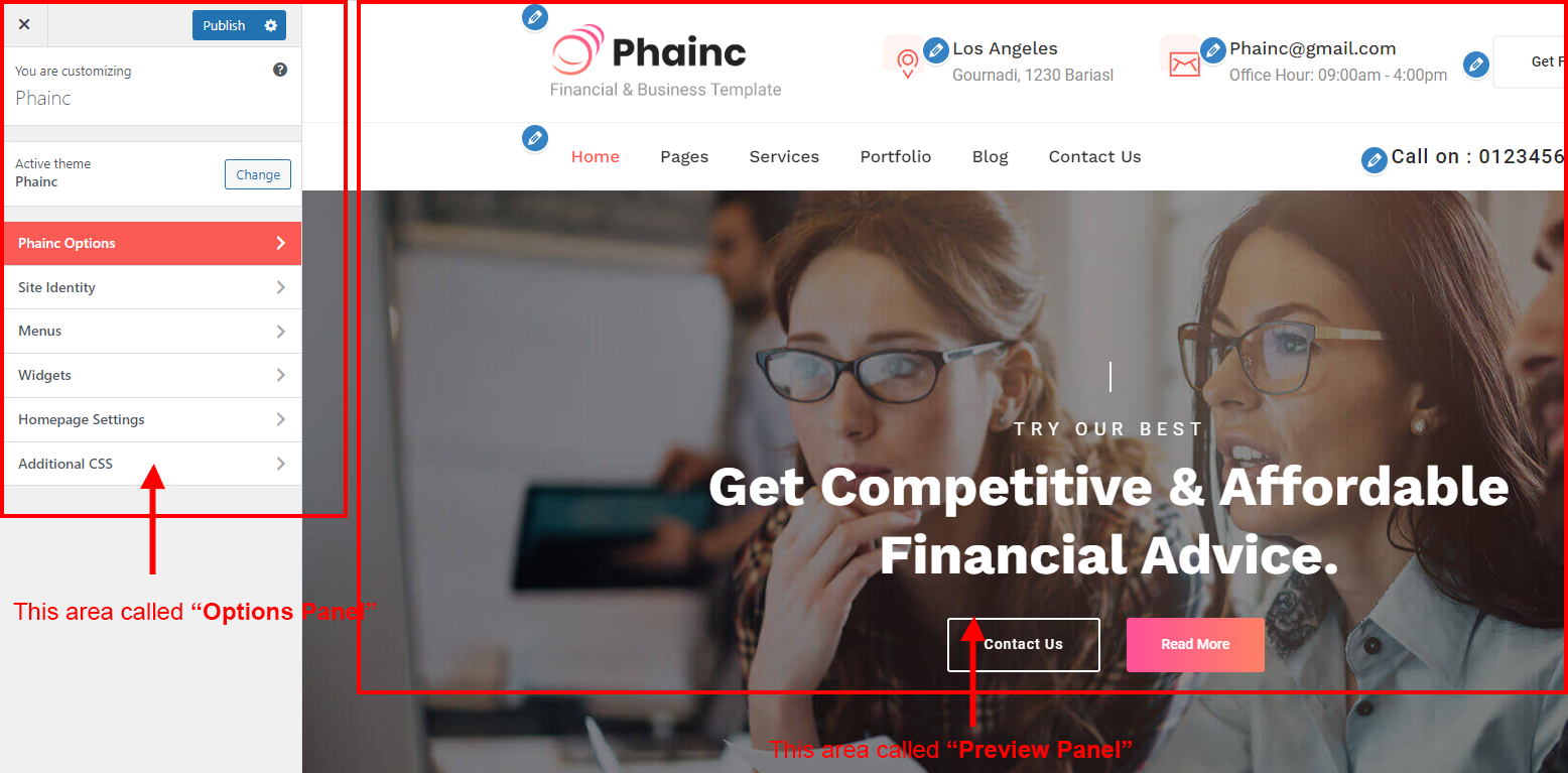 After clicking on the Phainc Options panel you will redirected to the Customize section. It has two sections. Left area called "Options Panel" and the right area called "Preview panel". See screenshot given below: