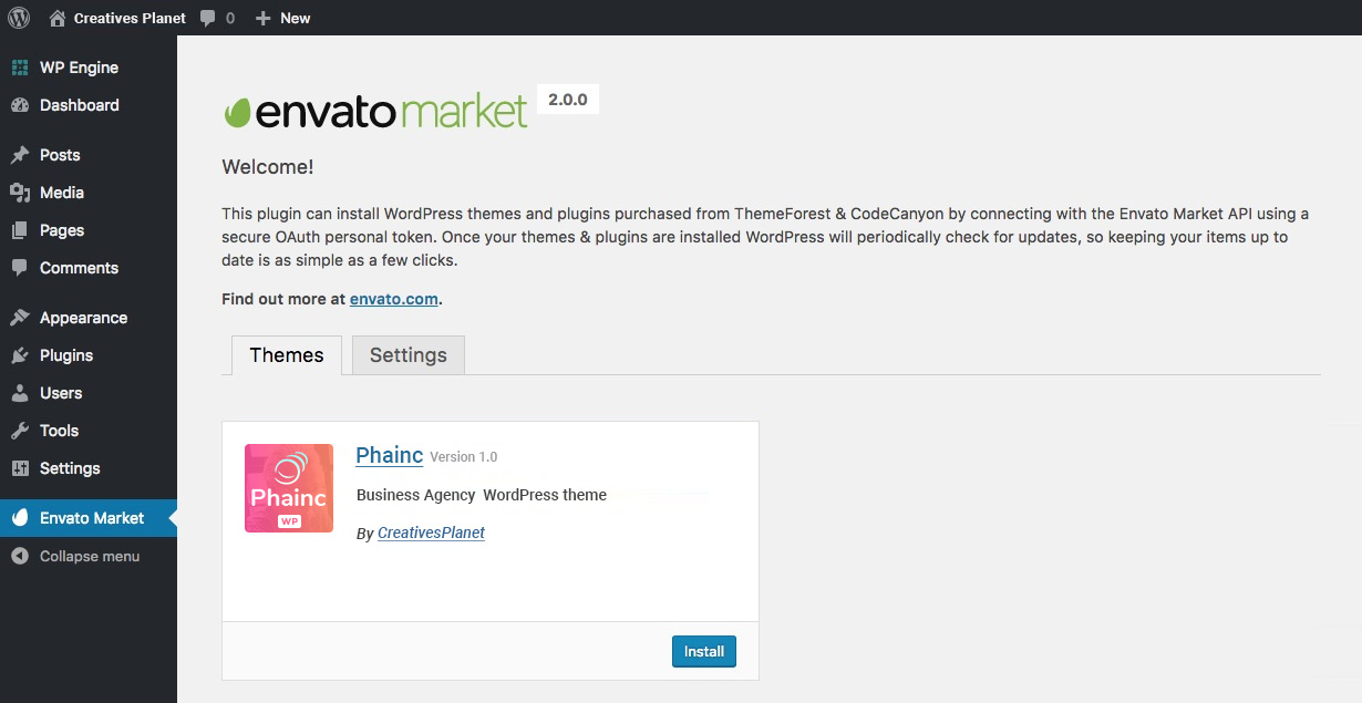 Once your token is saved and validated your page will refresh to show your Envato Market landing page with added tabs for your items. The added tab(s) display all of your theme and plugin purchases as well as their version numbers and quick links to the theme and author pages. So now you can install theme and also update theme in just one click.