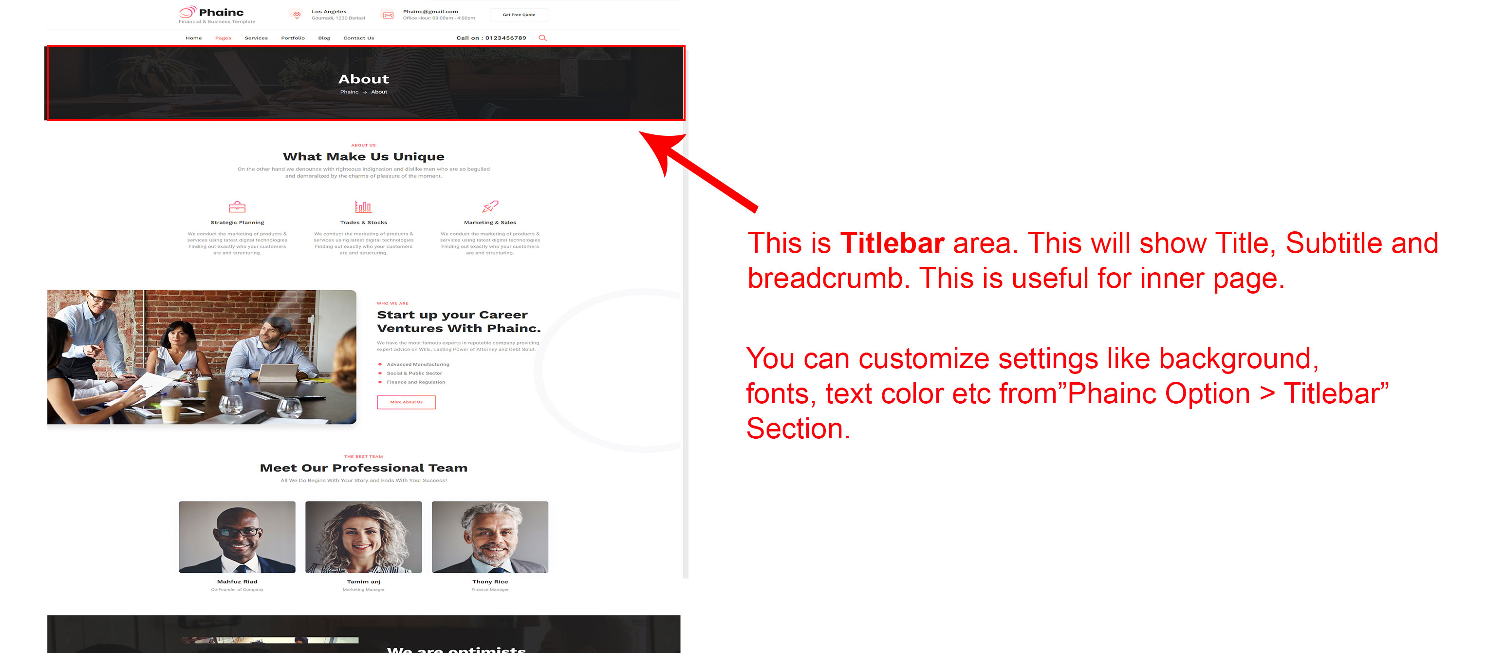 Generally the Titlebar will appear on inner page. This will appear below header area. This will show page title, subtitle and breadcrumb. (Where is Titlebar?)