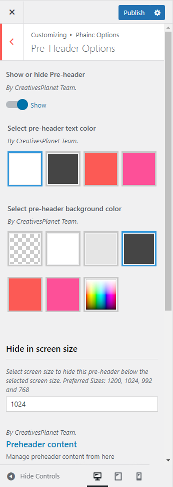 Pre-header section will appear above header area. You can show or hide it globally from Phainc Options >> Pre-header Settings section.