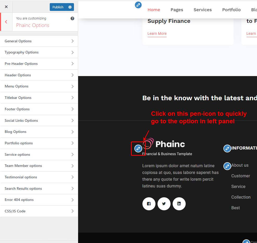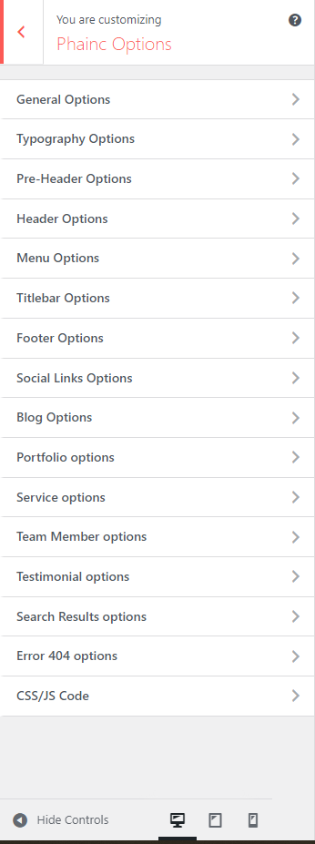 There are different sections in Phainc theme. Here you will find name of each section name so you can find their options easily. You can customize each sections from Phainc Options easily.