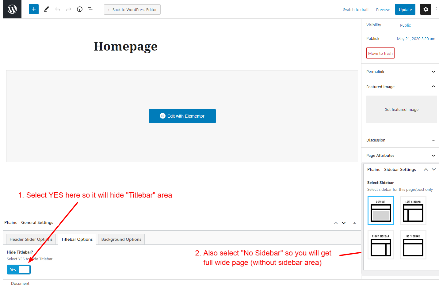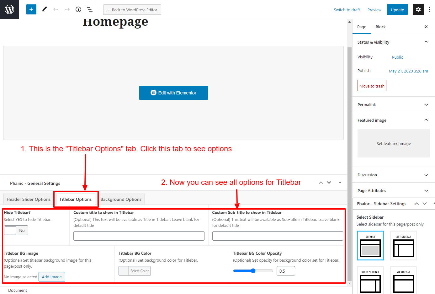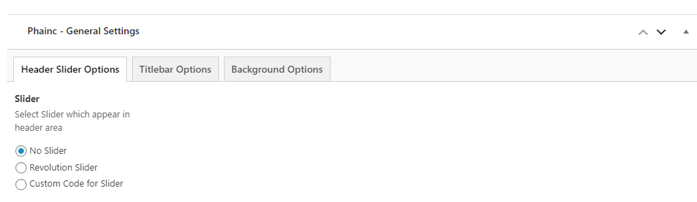 This will override the options set under Phainc Options > Titlebar Settings options. This will help you to set special design the Titlebar on specific page or post.