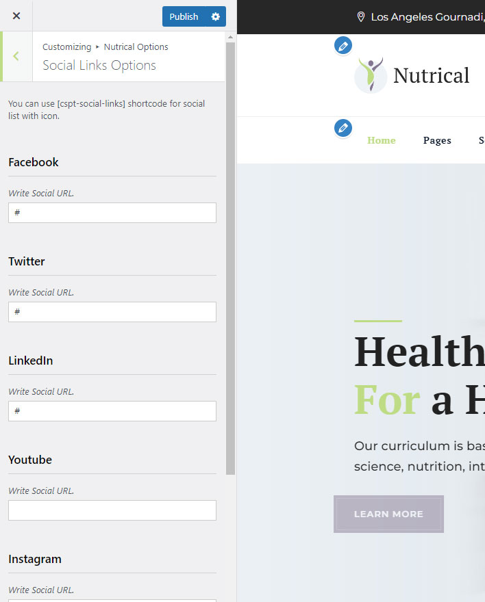This shortcode specially created to show social links. You can set social links in Phainc Options >> Social Links Section and write your social links. Than it can be shown using [cspt-social-links] shortcode.