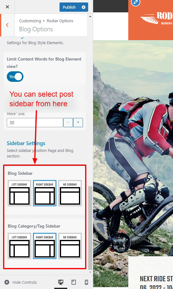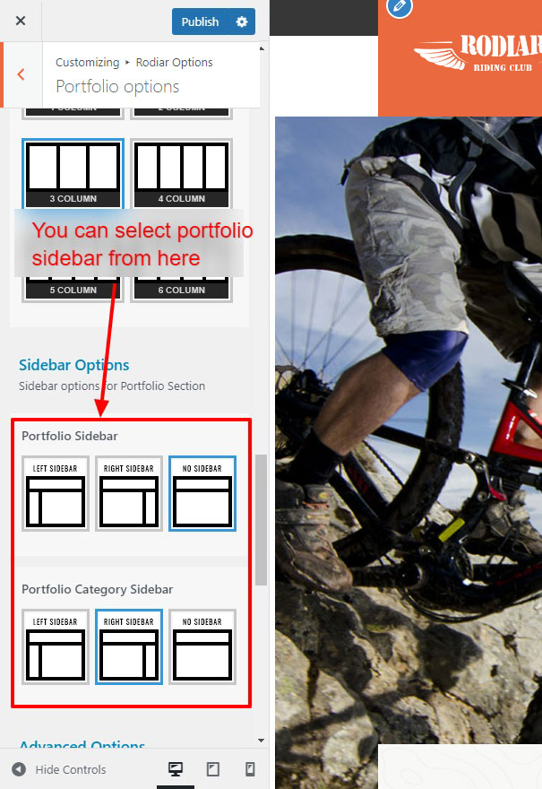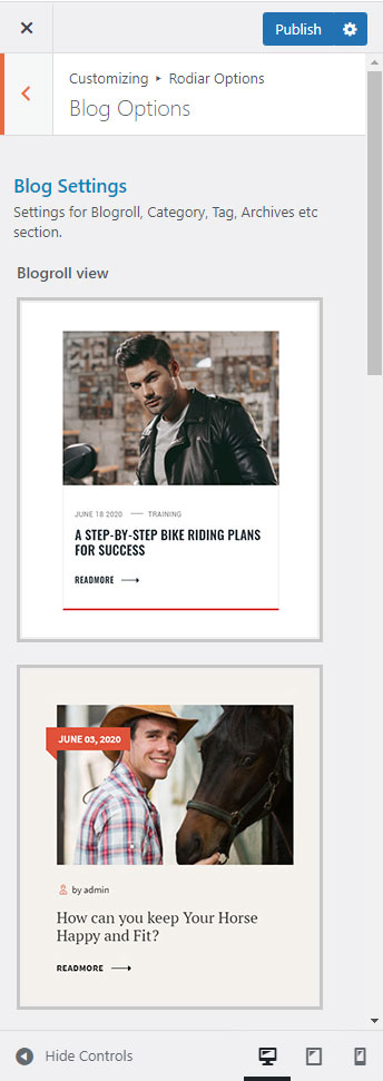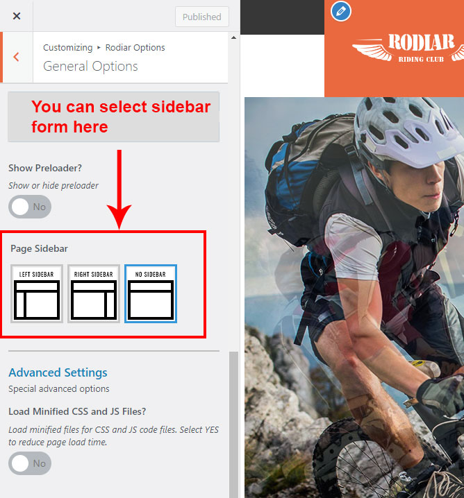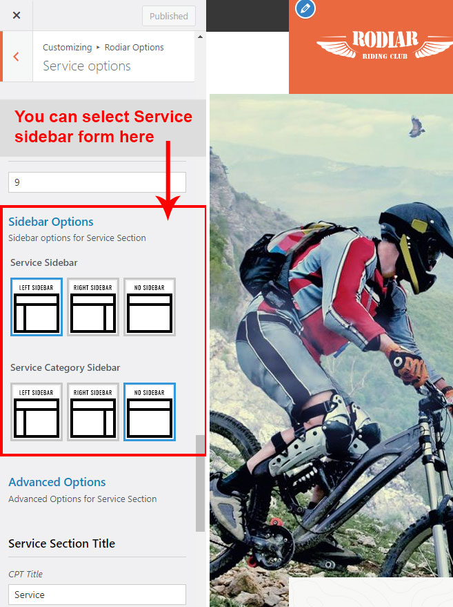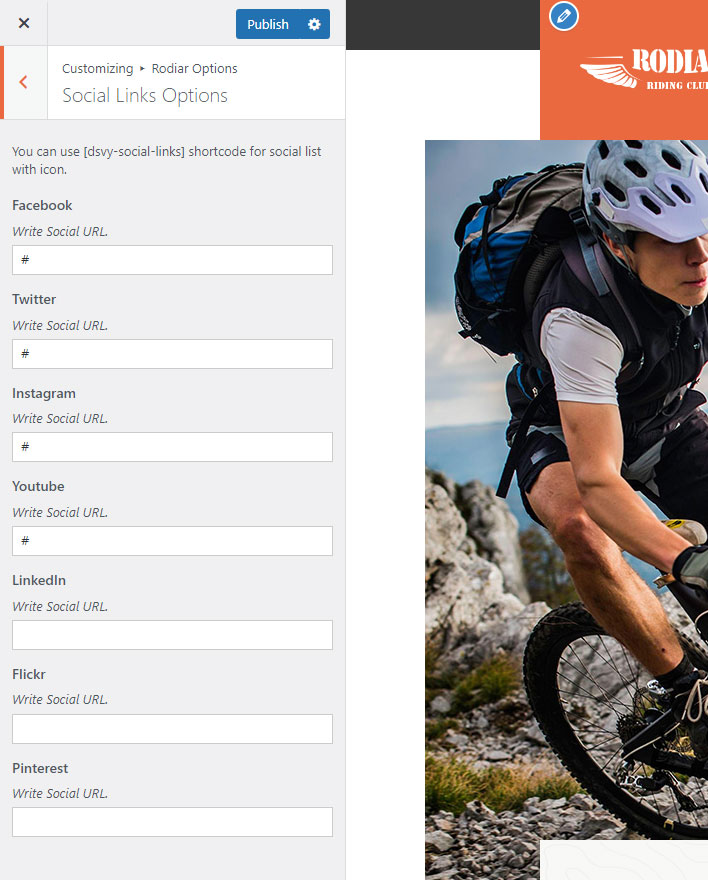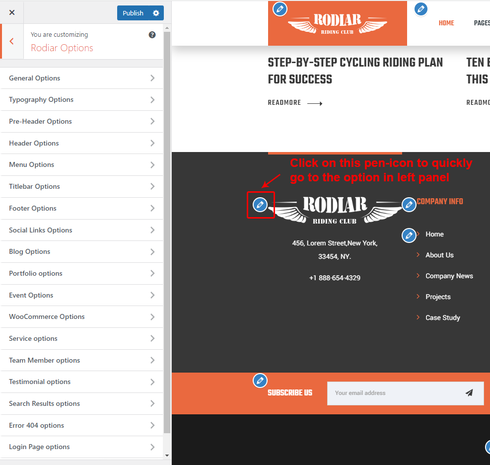 Rodiar Options (Theme Options) panel is created with WordPress' Customize section. We added our own options with WordPress' default options.