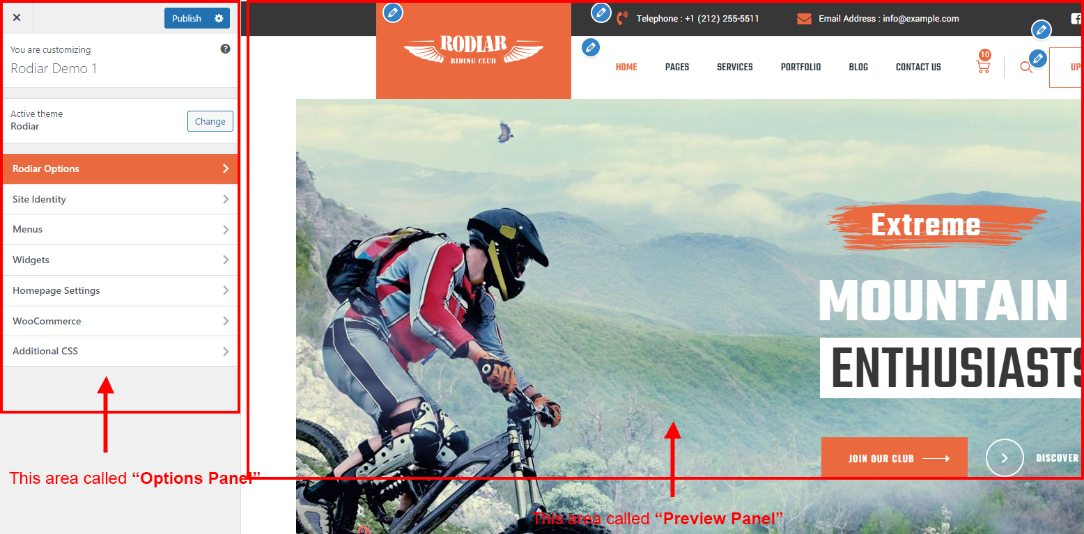 After clicking on the Rodiar Options panel you will redirected to the Customize section. It has two sections. Left area called "Options Panel" and the right area called "Preview panel". See screenshot given below: