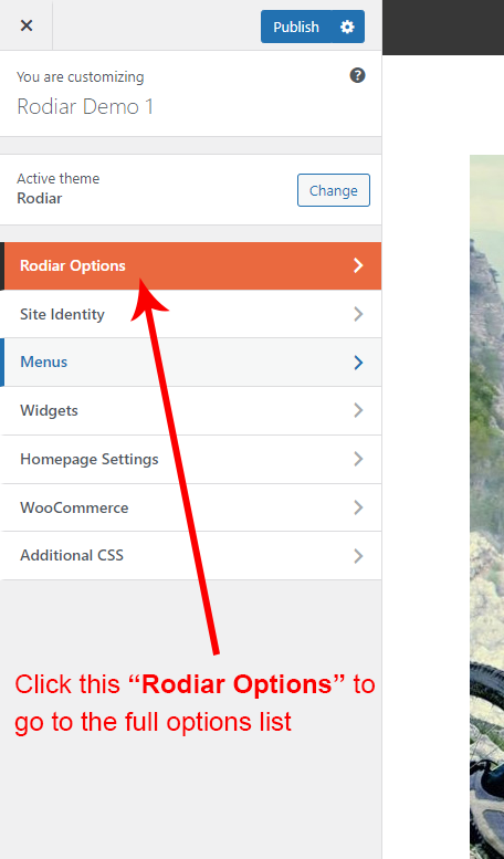 There are different sections in Rodiar theme. Here you will find name of each section name so you can find their options easily. You can customize each sections from Rodiar Options easily.