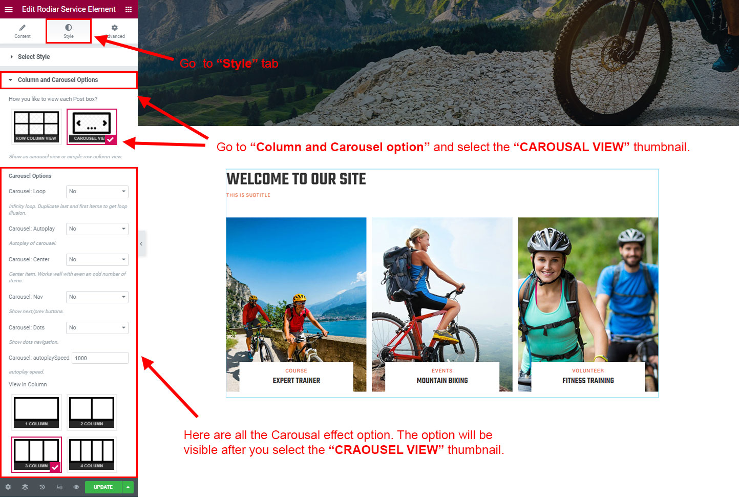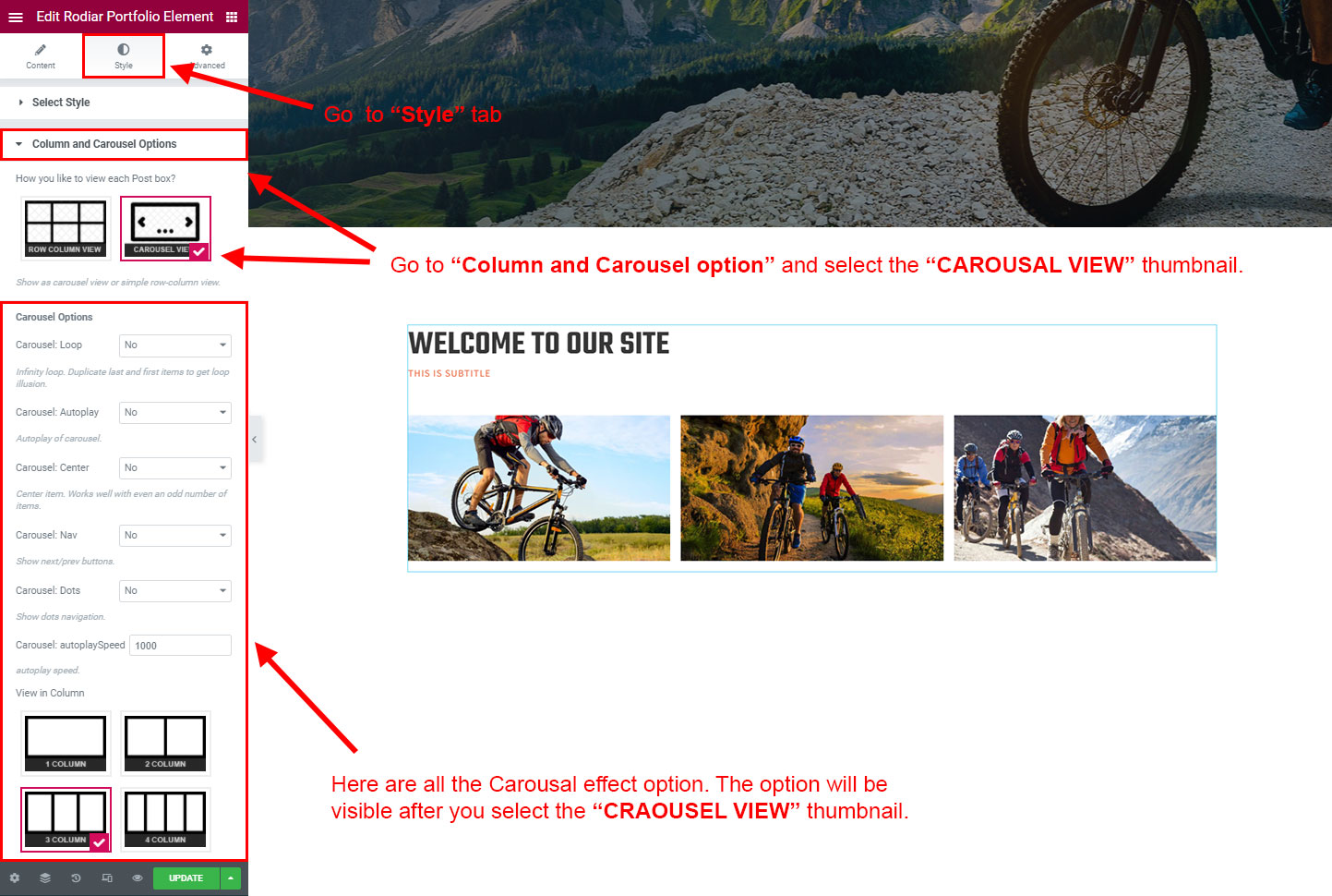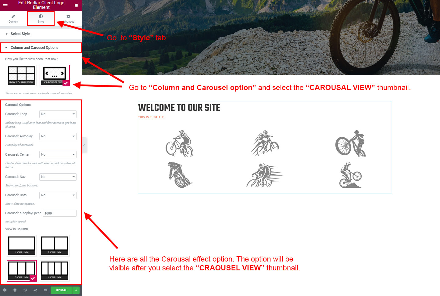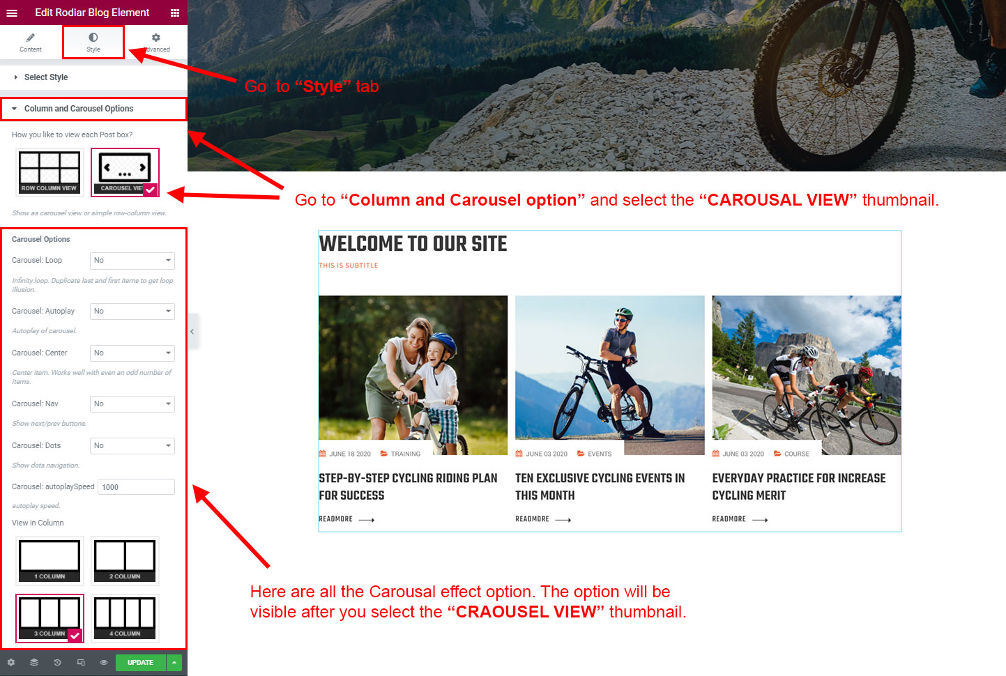 CAROSUEL VIEW: The Carousel view will be animated sliding view. There are lot's of options for the slideing animatins. Like animation speed, animation column, auto-play on or off, Loop post boxes, show/hide the dot or arrow navigation etc.