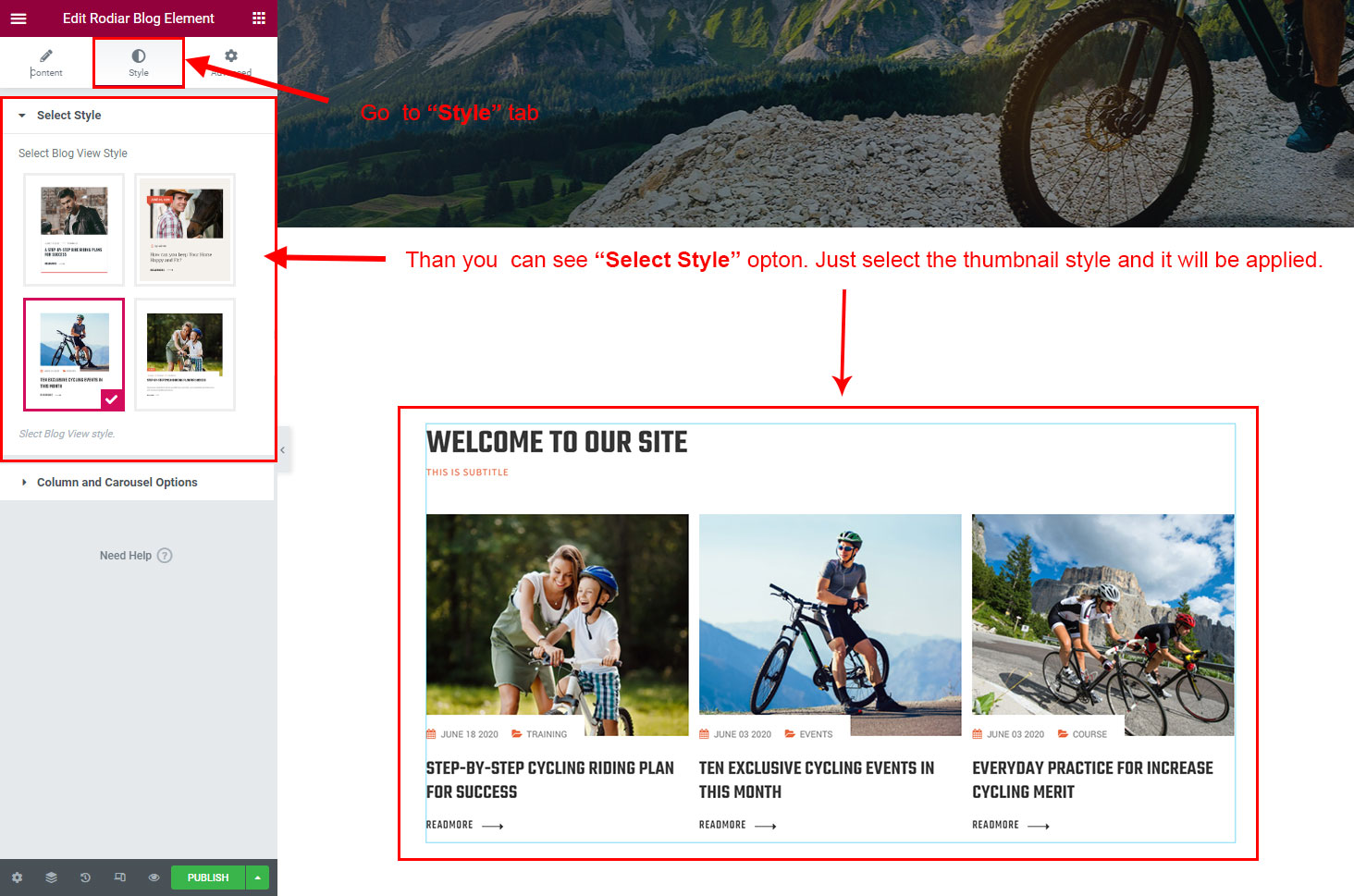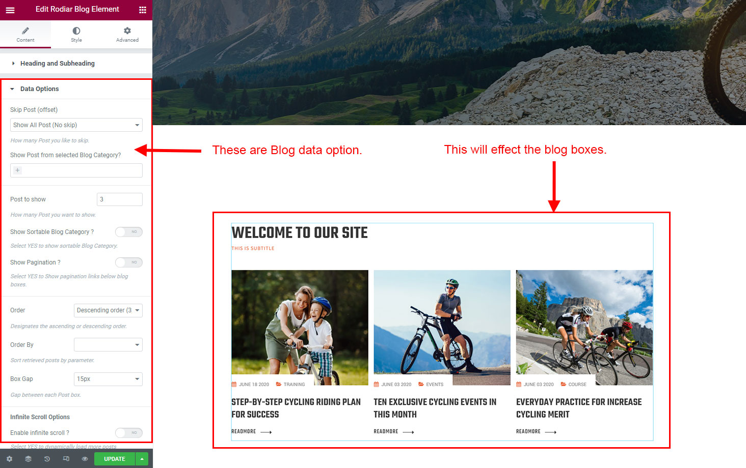 We created a Blog Element in Elementor Page Builder which you can use to show post on any page you want. Just drag and drop the Rodiar Blog Element on any page and the post list will appear.