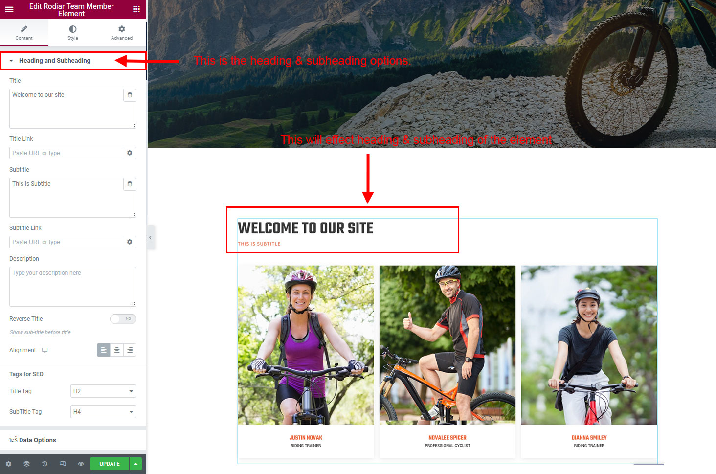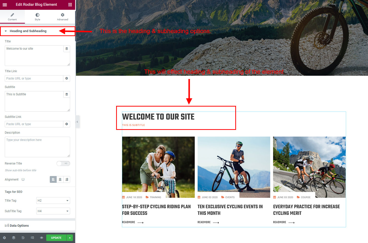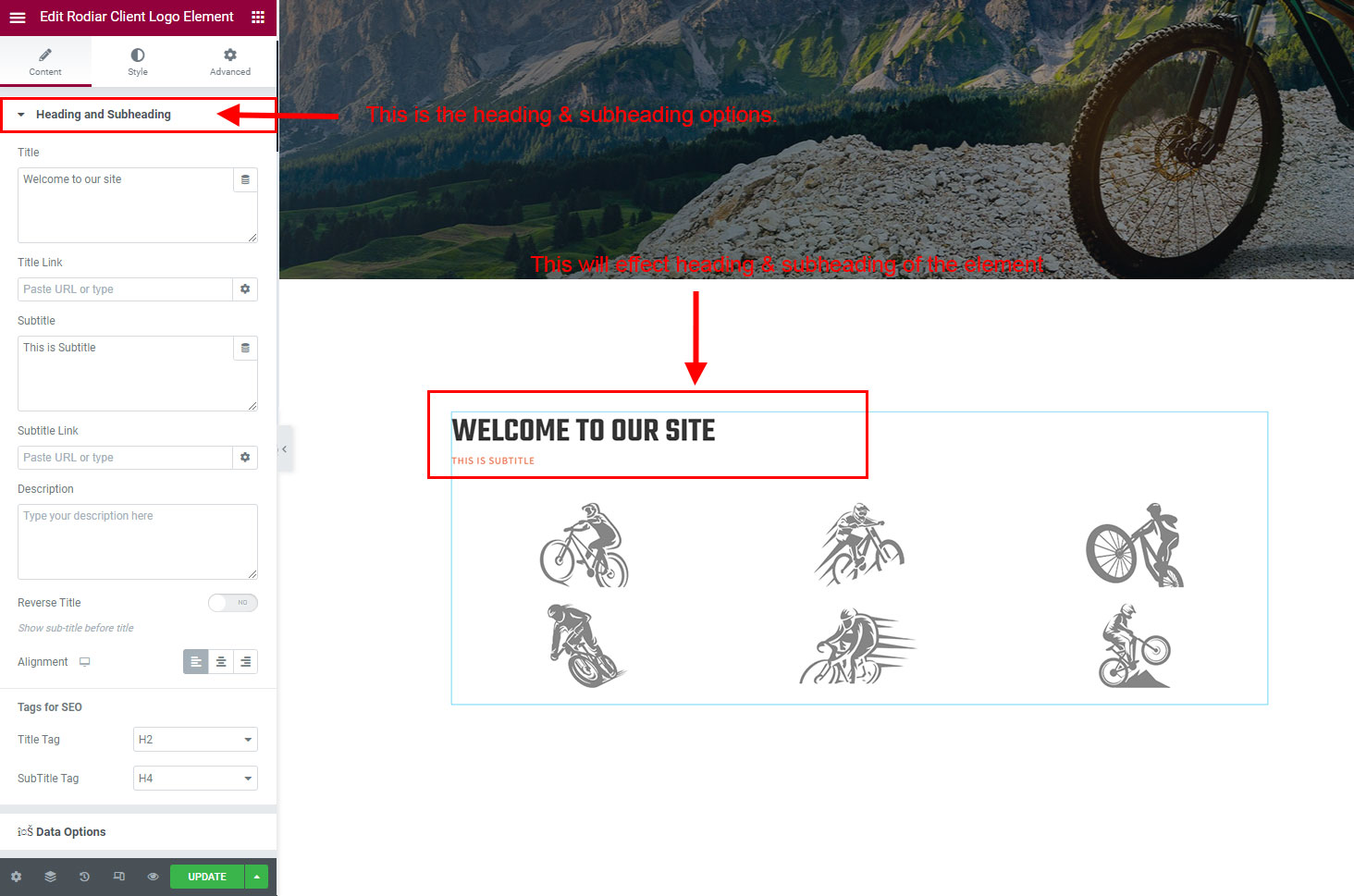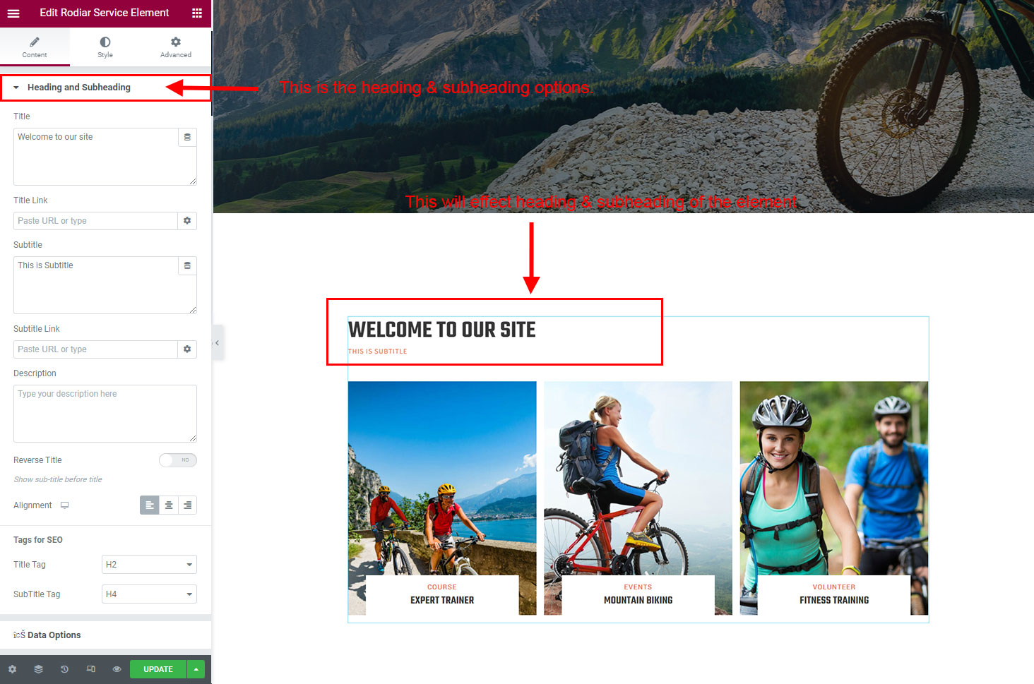 The heading and subheading will appear at top of the element. You can change text, add link to the heading or subheading, change alignment, change tag (for SEO purpose) etc.