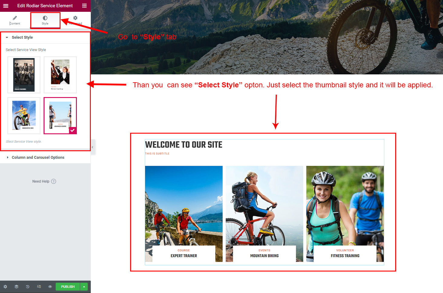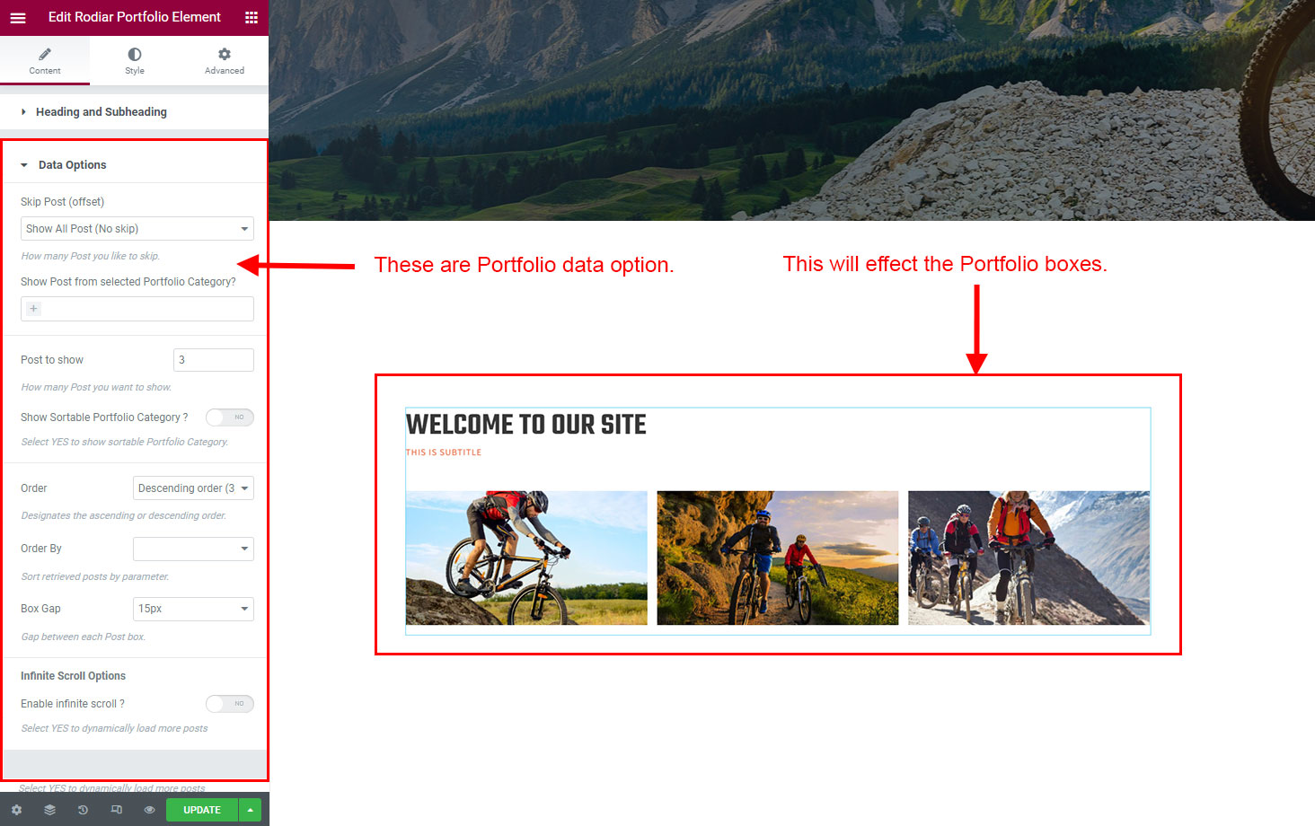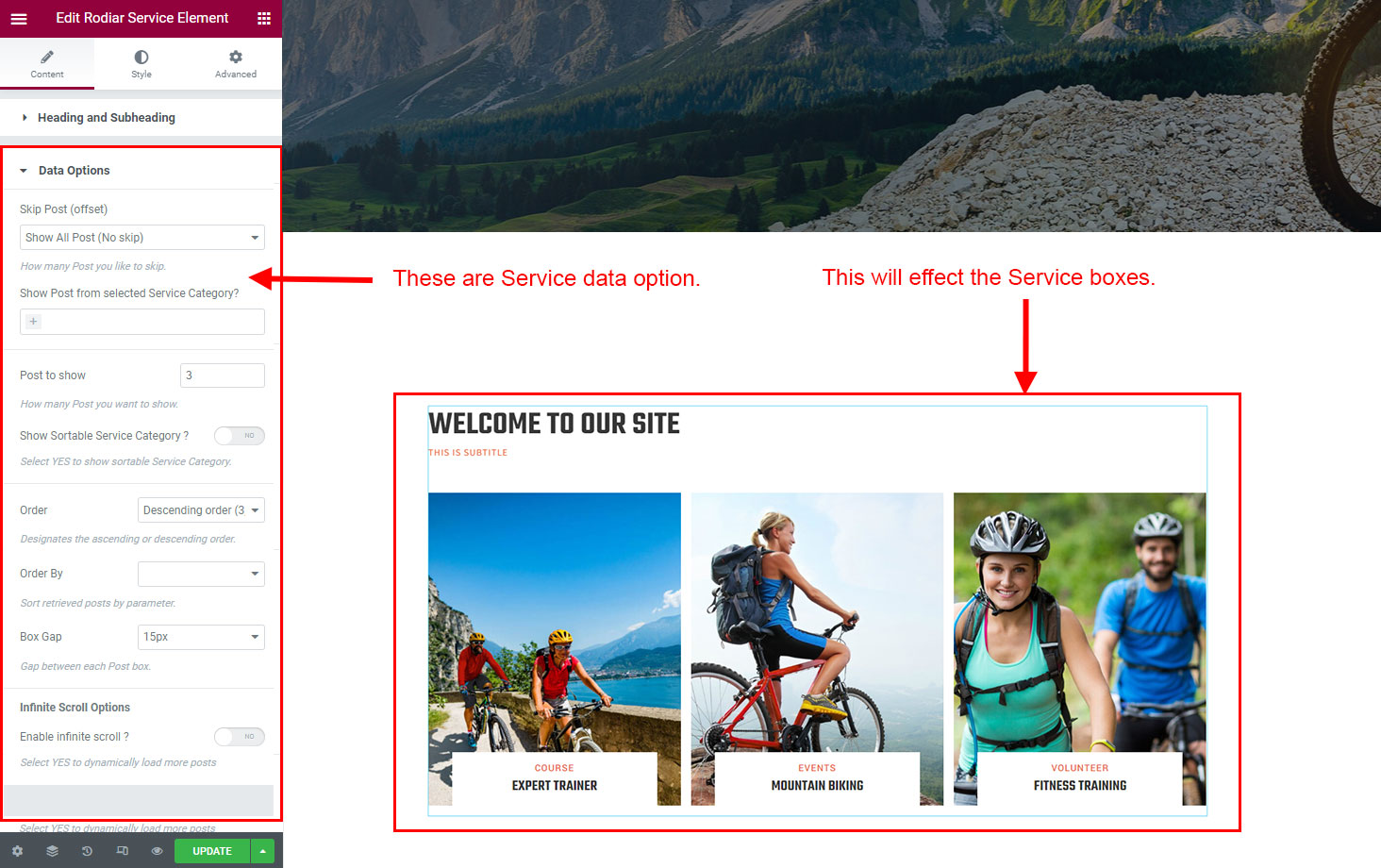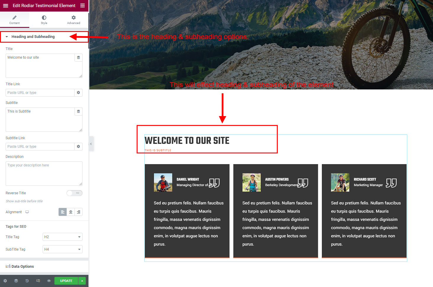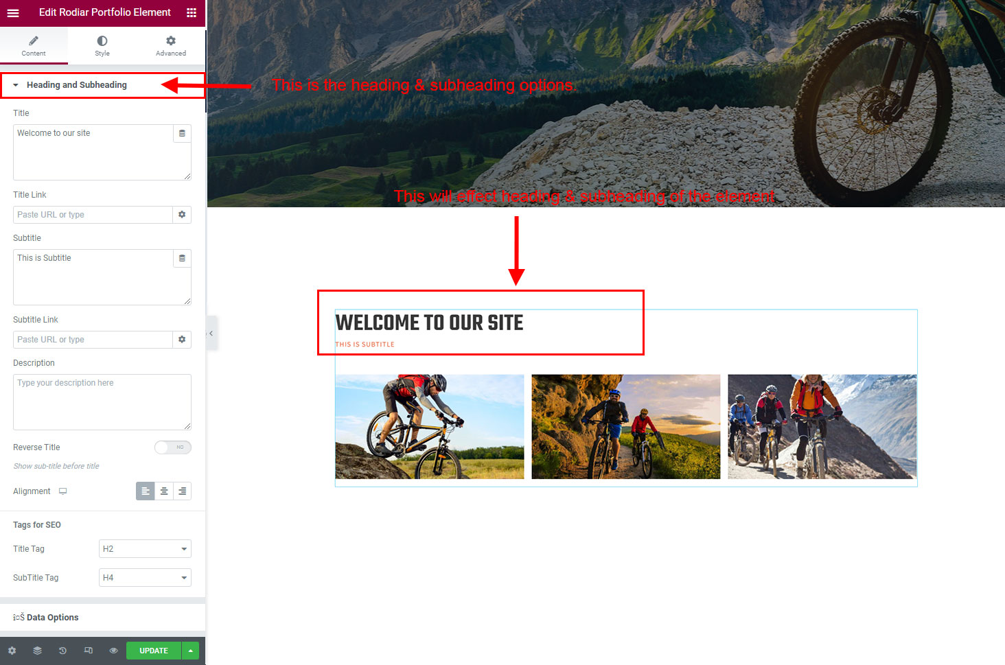 The heading and subheading will appear at top of the element. You can change text, add link to the heading or subheading, change alignment, change tag (for SEO purpose) etc.