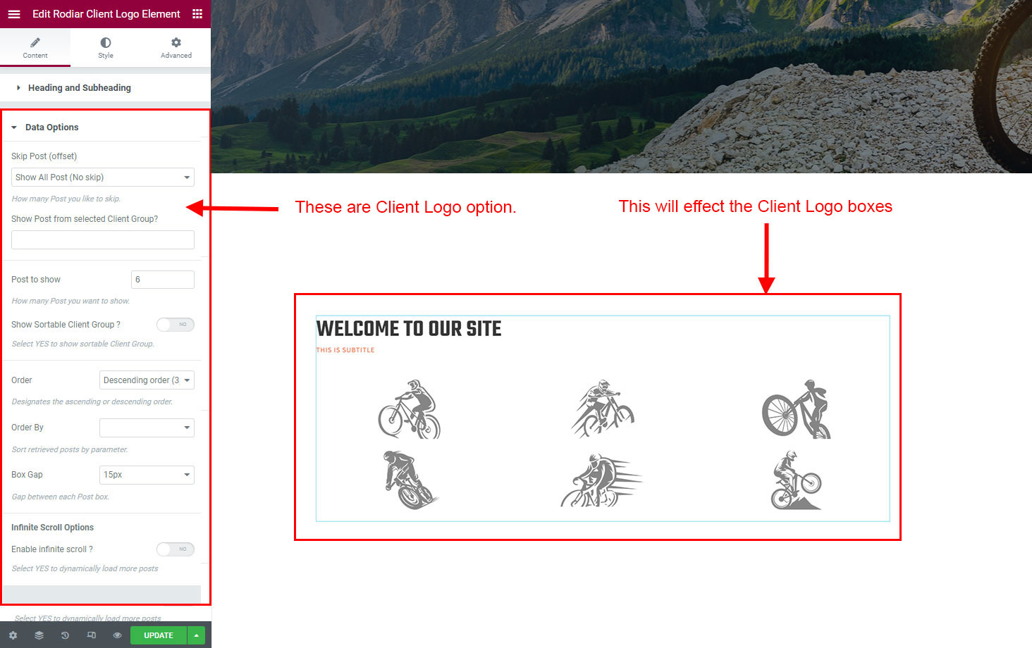 You can select the client-logo options here. Like how many client-logo you like to show, show client-logo from selected group (category), client-logo order etc.