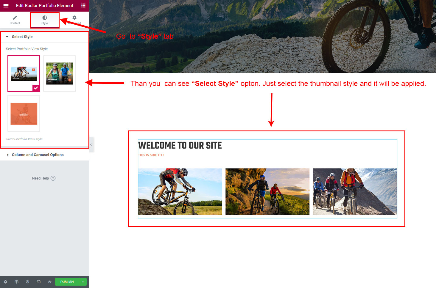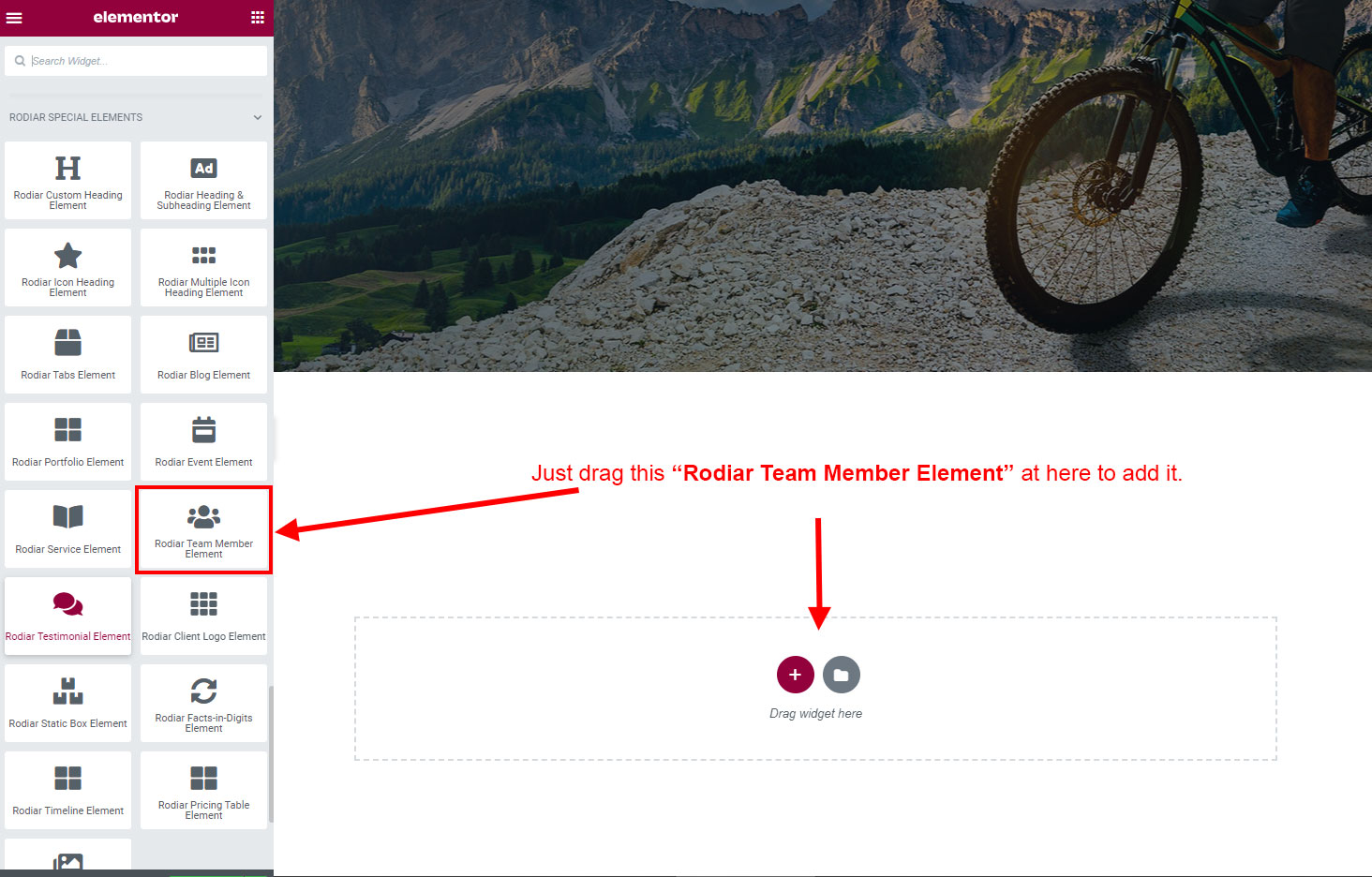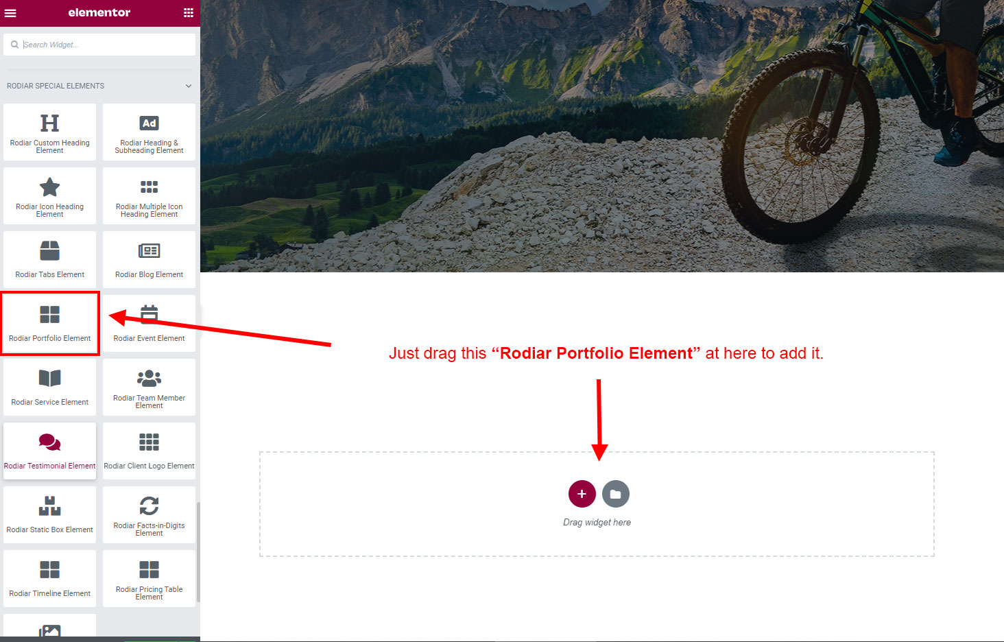 Now we have some Portfolio posts. So we can show all Portfolio on a page. Create a new page and add Rodiar Portfolio Element on a page by dragging it.