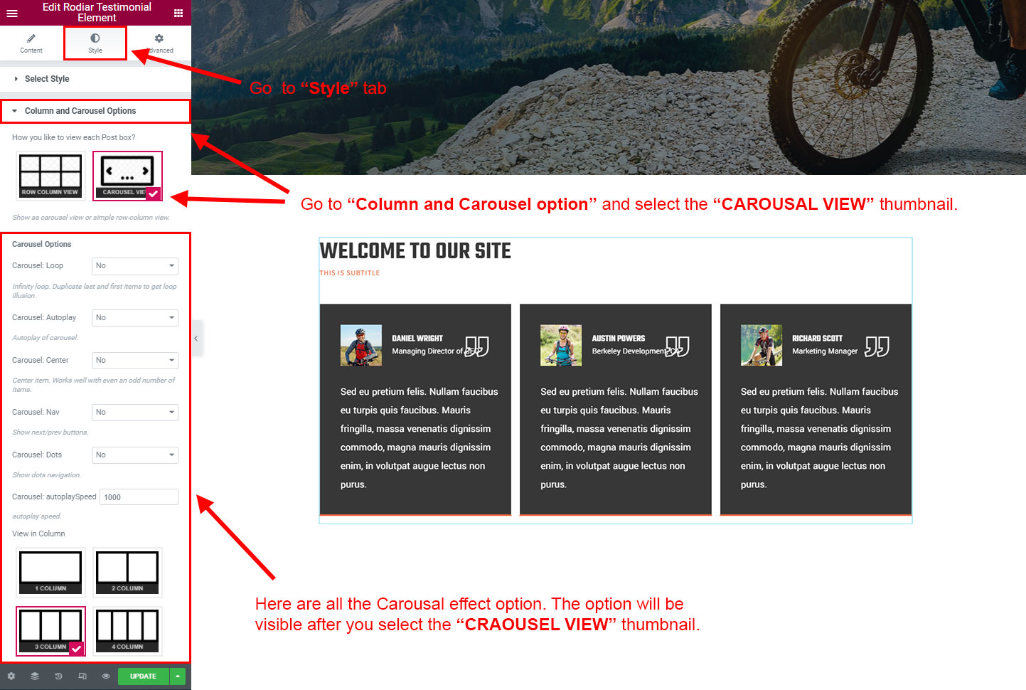 CAROUSEL VIEW: The Carousel view will be animated sliding view. There are lot's of options for the slideing animations. Like animation speed, animation column, auto-play on or off, Loop post boxes, show/hide the dot or arrow navigation etc.
