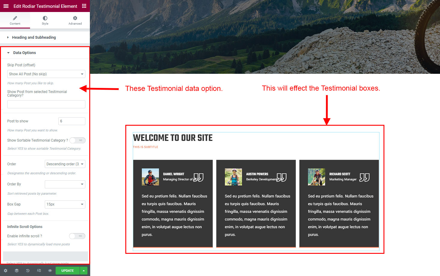 You can select the testimonial options here. Like how many testimonial you like to show, show testimonial from selected group (category), testimonial order etc.