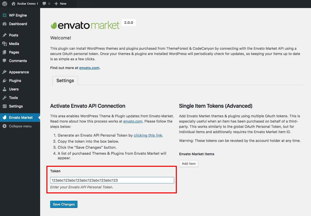 Now go back to your WordPress installation and paste in your Envato API token then click save.