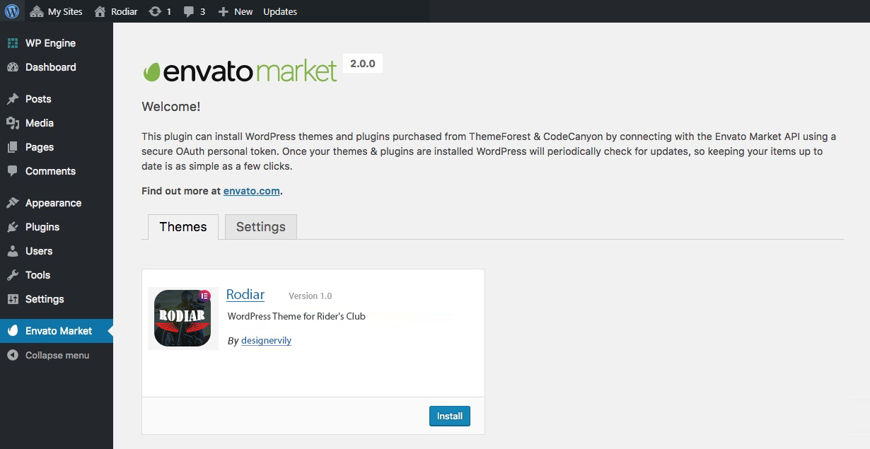 Once your token is saved and validated your page will refresh to show your Envato Market landing page with added tabs for your items. The added tab(s) display all of your theme and plugin purchases as well as their version numbers and quick links to the theme and author pages. So now you can install theme and also update theme in just one click.