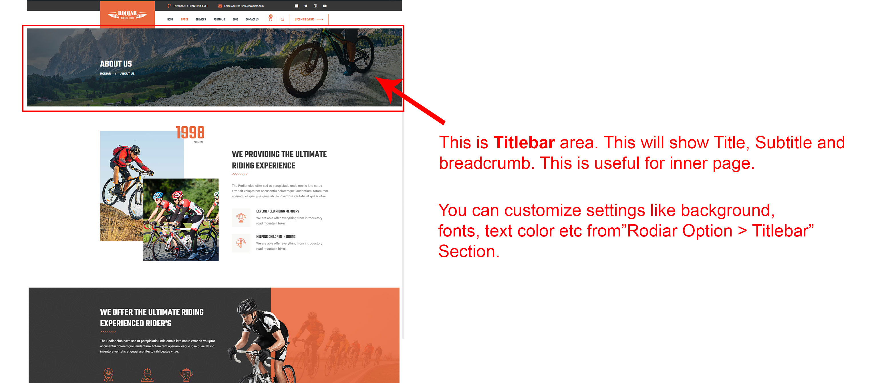 Generally the Titlebar will appear on inner page. This will appear below header area. This will show page title, subtitle and breadcrumb. (Where is Titlebar?)
