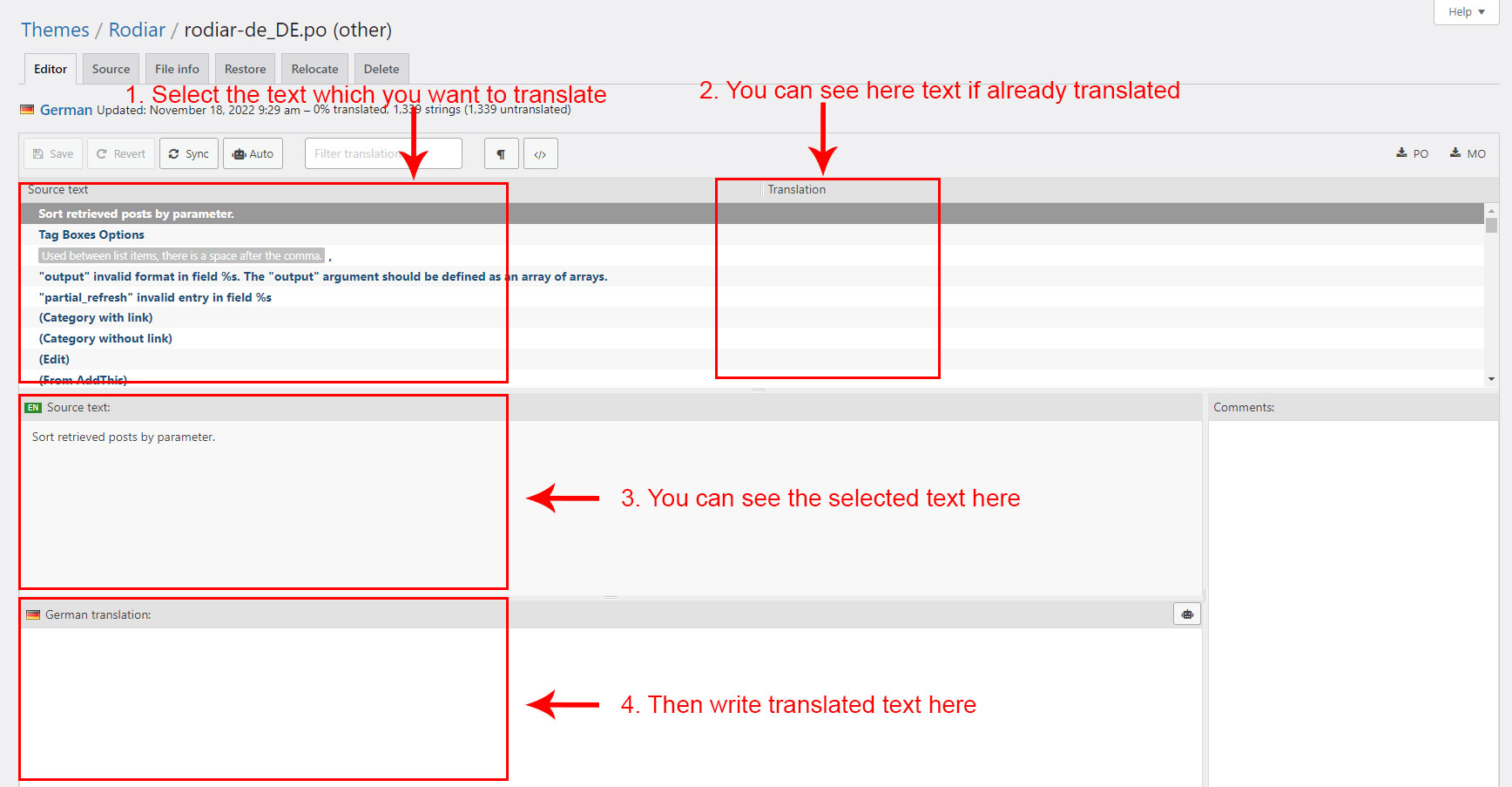 When you are done translating all the needed text strings into your desired language, save the file in /wp-content/languages/themes/ folder with language code in name. For example, if you were translating to the Deutsch language, you would save it as rodiar-de_DE.po. The corresponding rodiar-de_DE.mo file will be auto created by POEdit software.