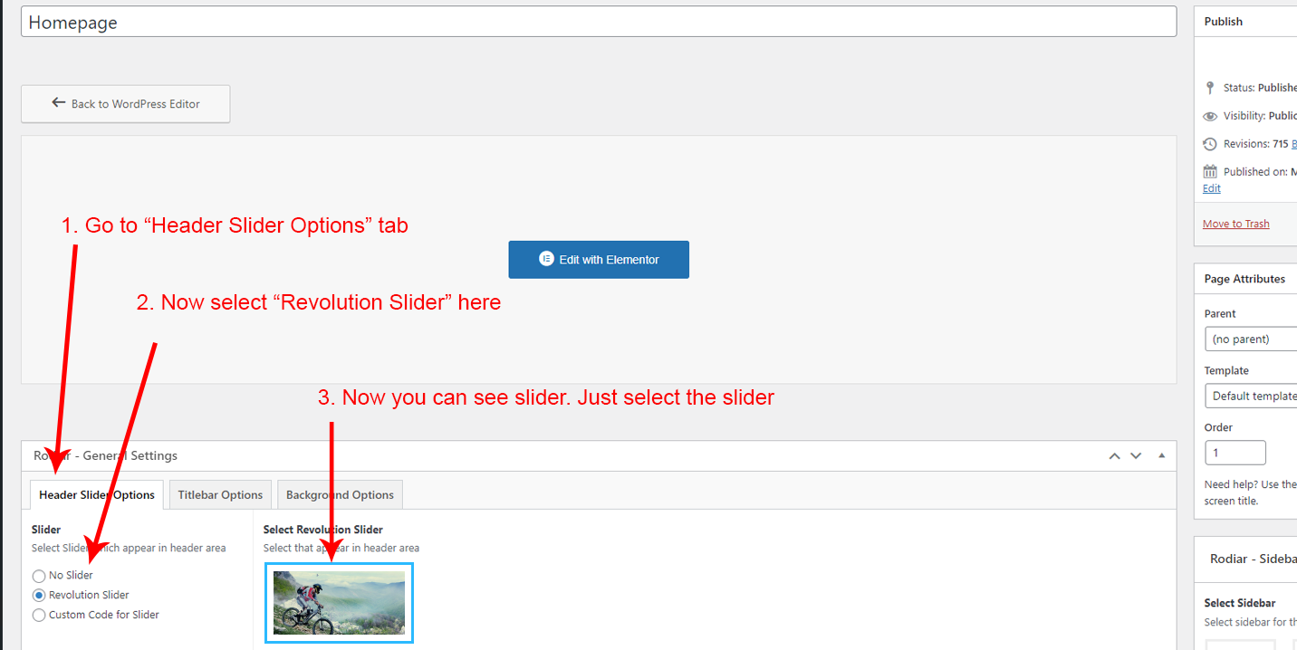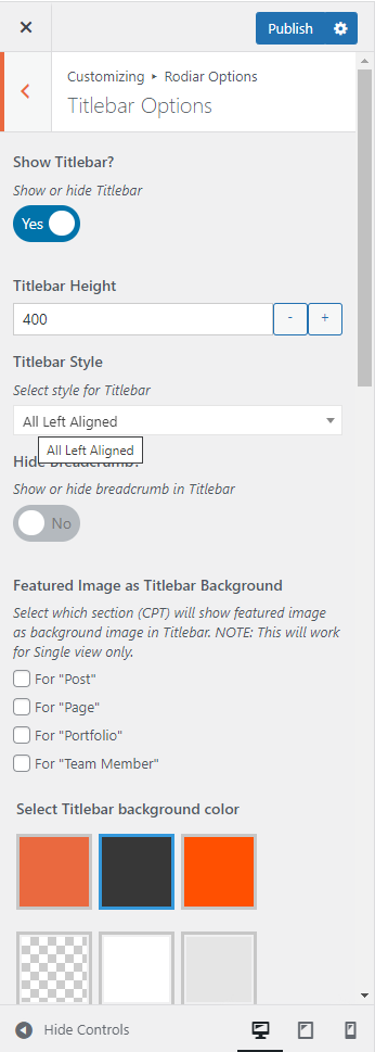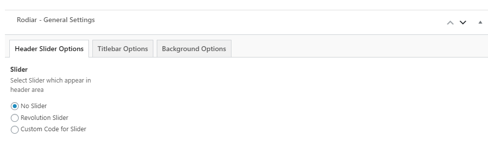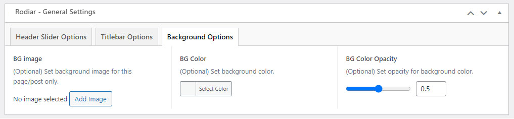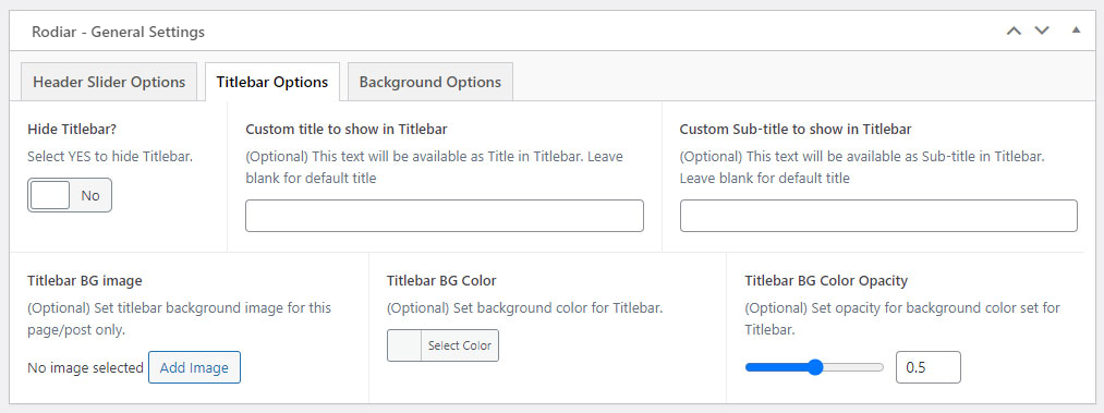 This will override the options set under Rodiar Options > Titlebar Settings options. This will help you to set special design the Titlebar on specific page or post.