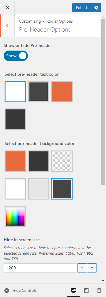 Pre-header section will appear above header area. You can show or hide it globally from Rodiar Options >> Pre-header Settings section.