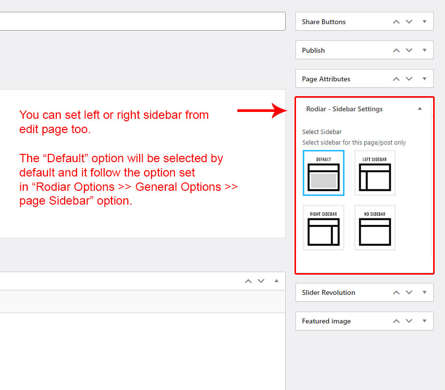 This is specially created sidebar postion (either left or right as selected in Rodiar Options section) that will be shown as sidebar widget on Blog pages like blog list view, single post view, blog category view etc.