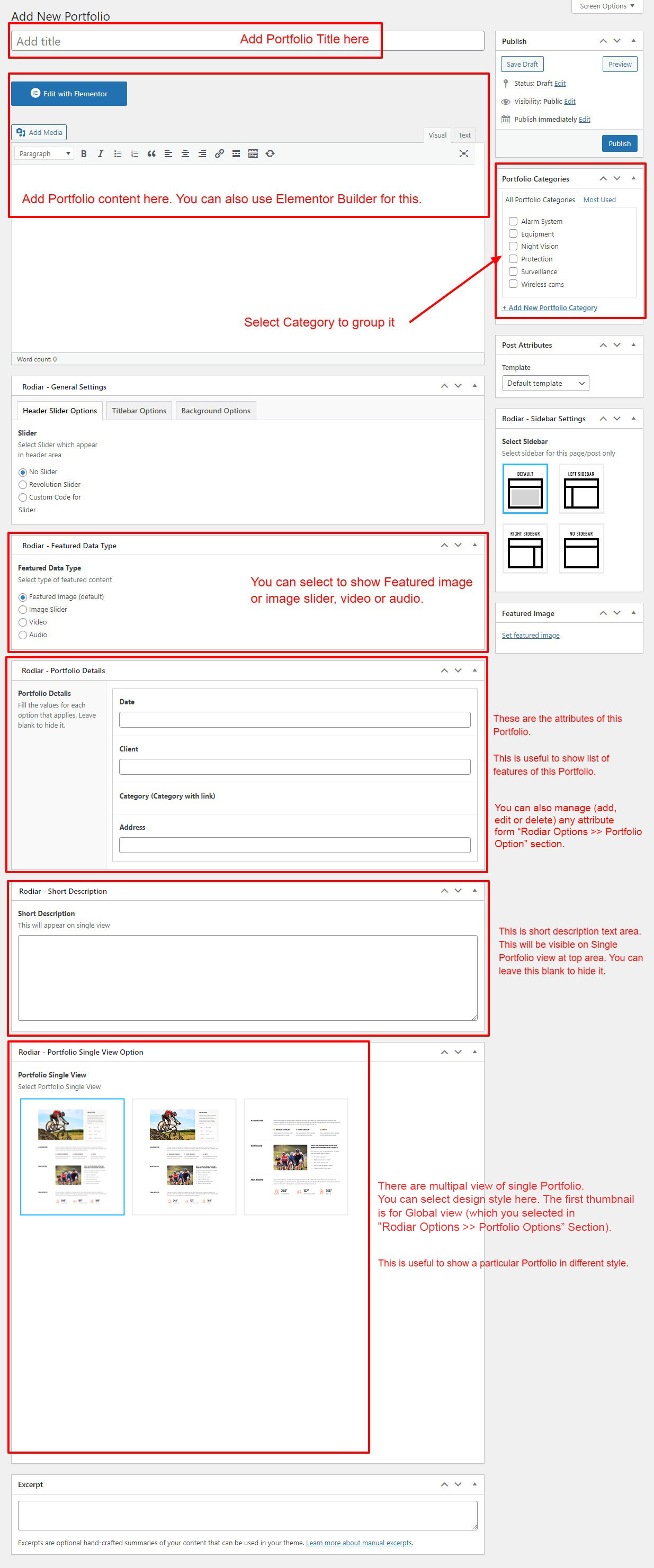 If you already done demo content setup than you can edit existing portfolio and check how we added data so you can understand each option perfectly.