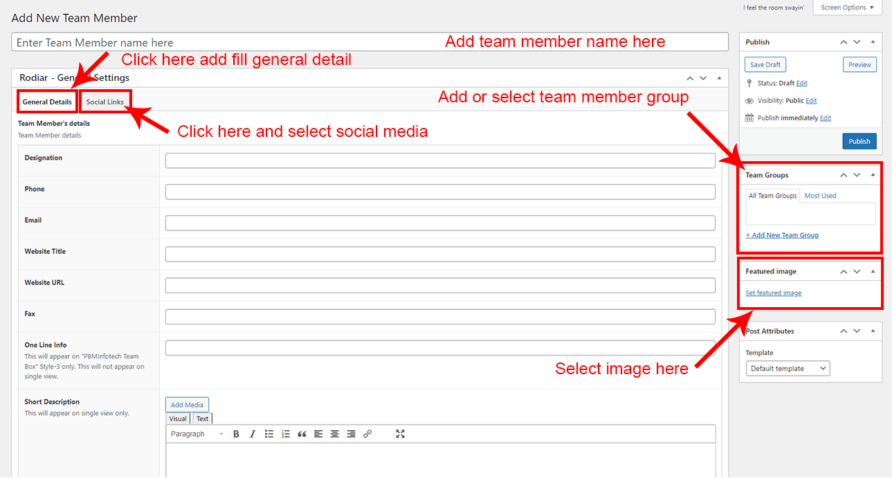 If you already done demo content setup than you can edit existing Team and check how we added data so you can understand each option perfectly.