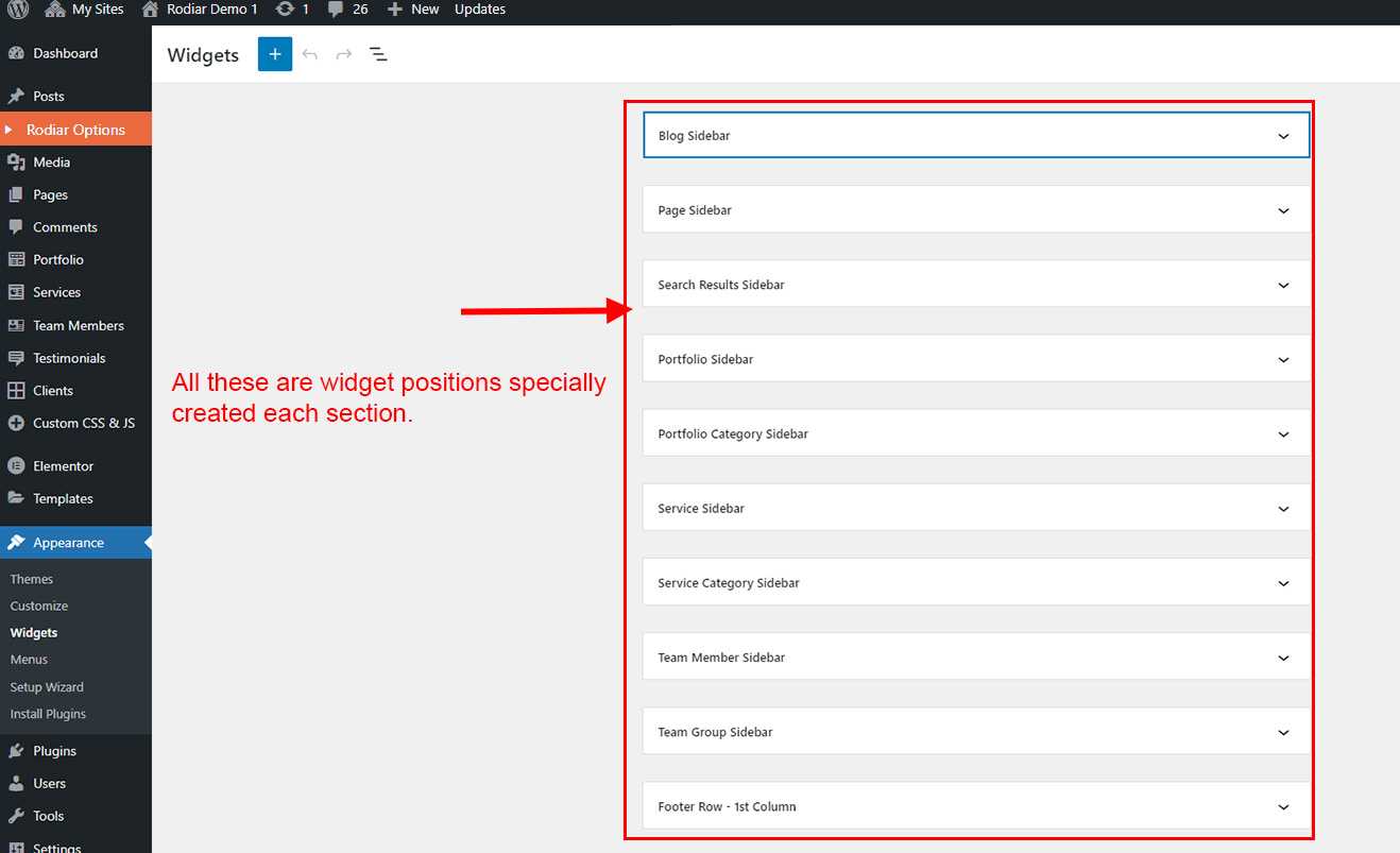 Rodiar theme comes with widgets and different positions. We created special widget positions for each section so you can show sidebar and footer widgets properly according to content. Here are description of all widget positions: