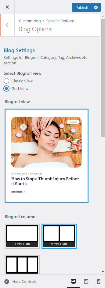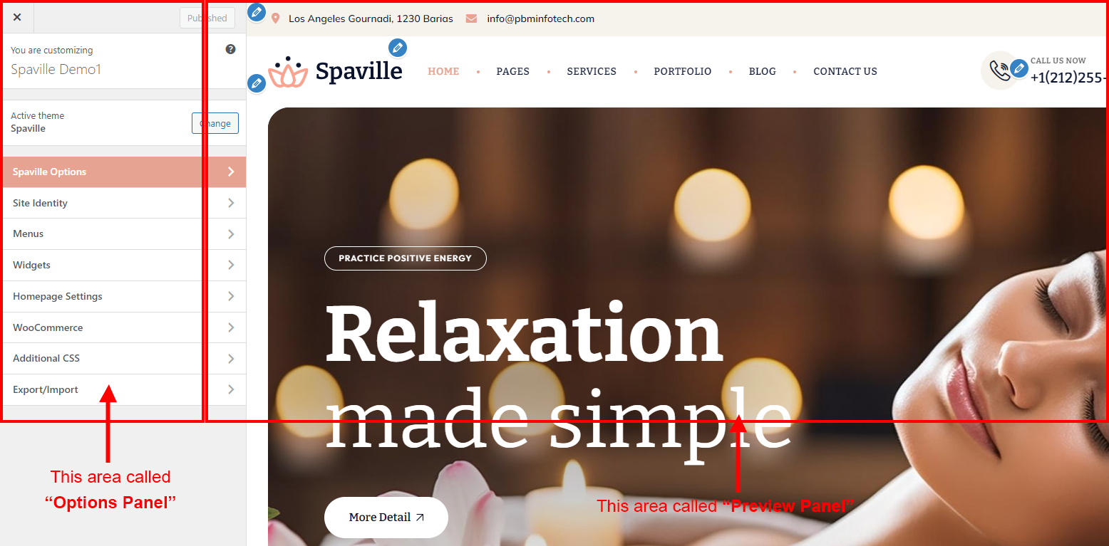 After clicking on the Spaville Options panel you will redirected to the Customize section. It has two sections. Left area called "Options Panel" and the right area called "Preview panel". See screenshot given below: