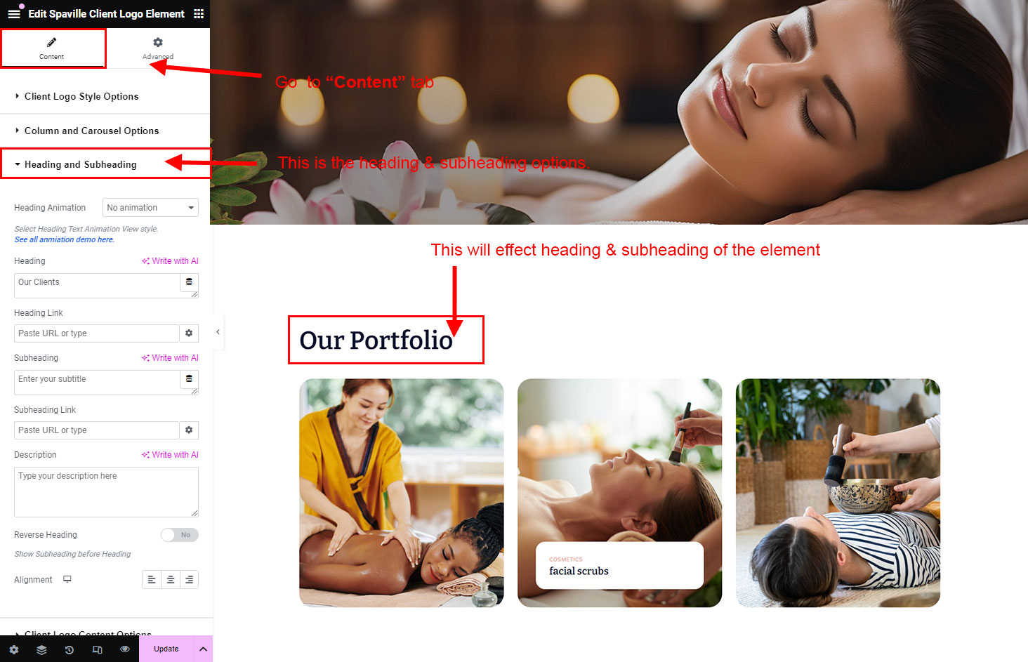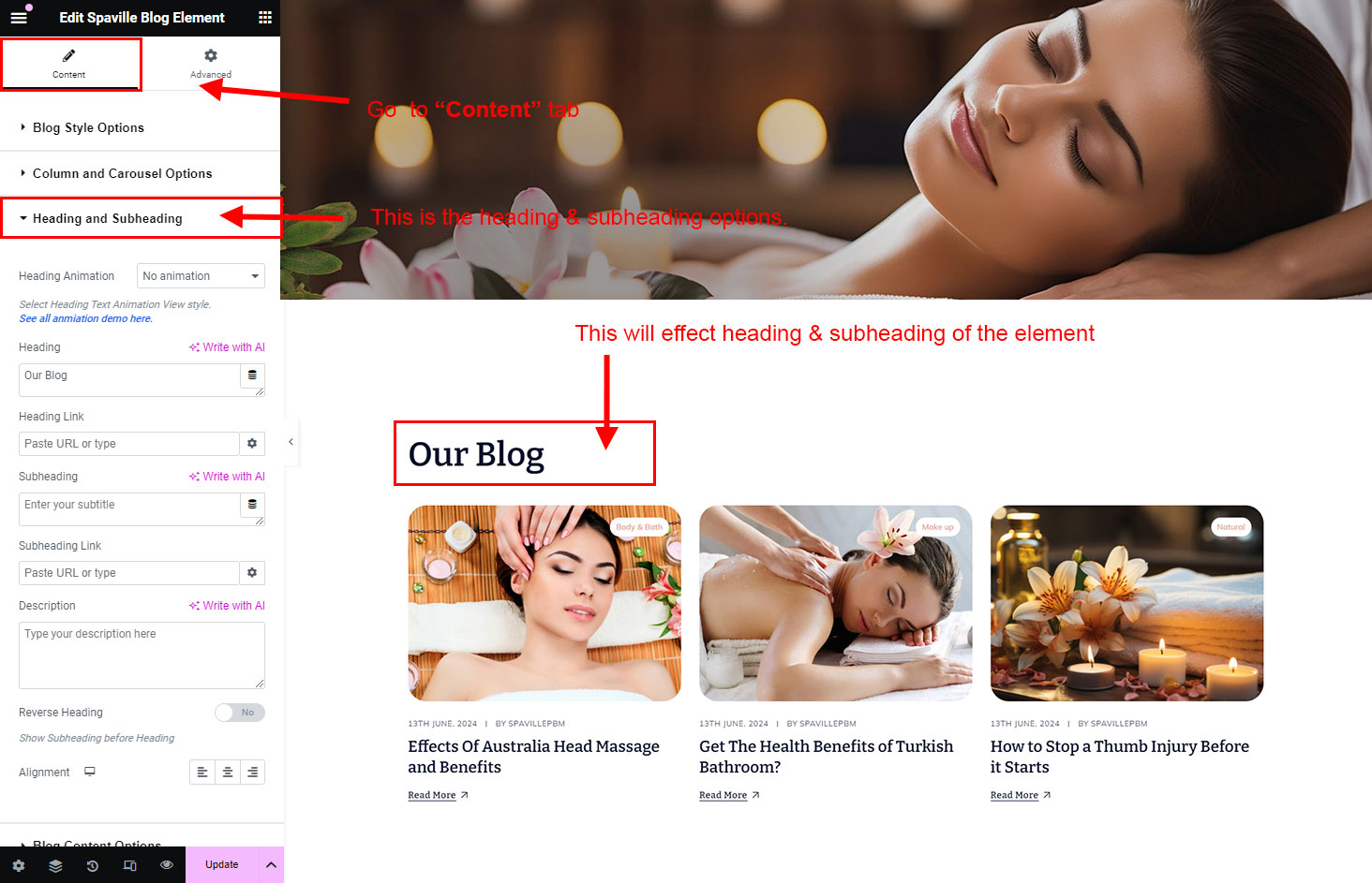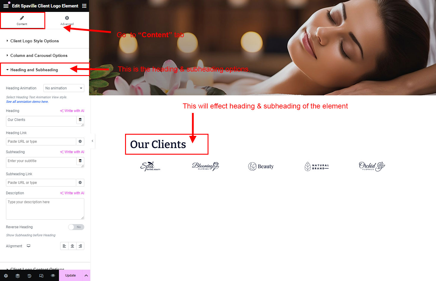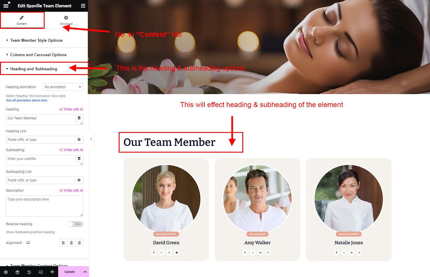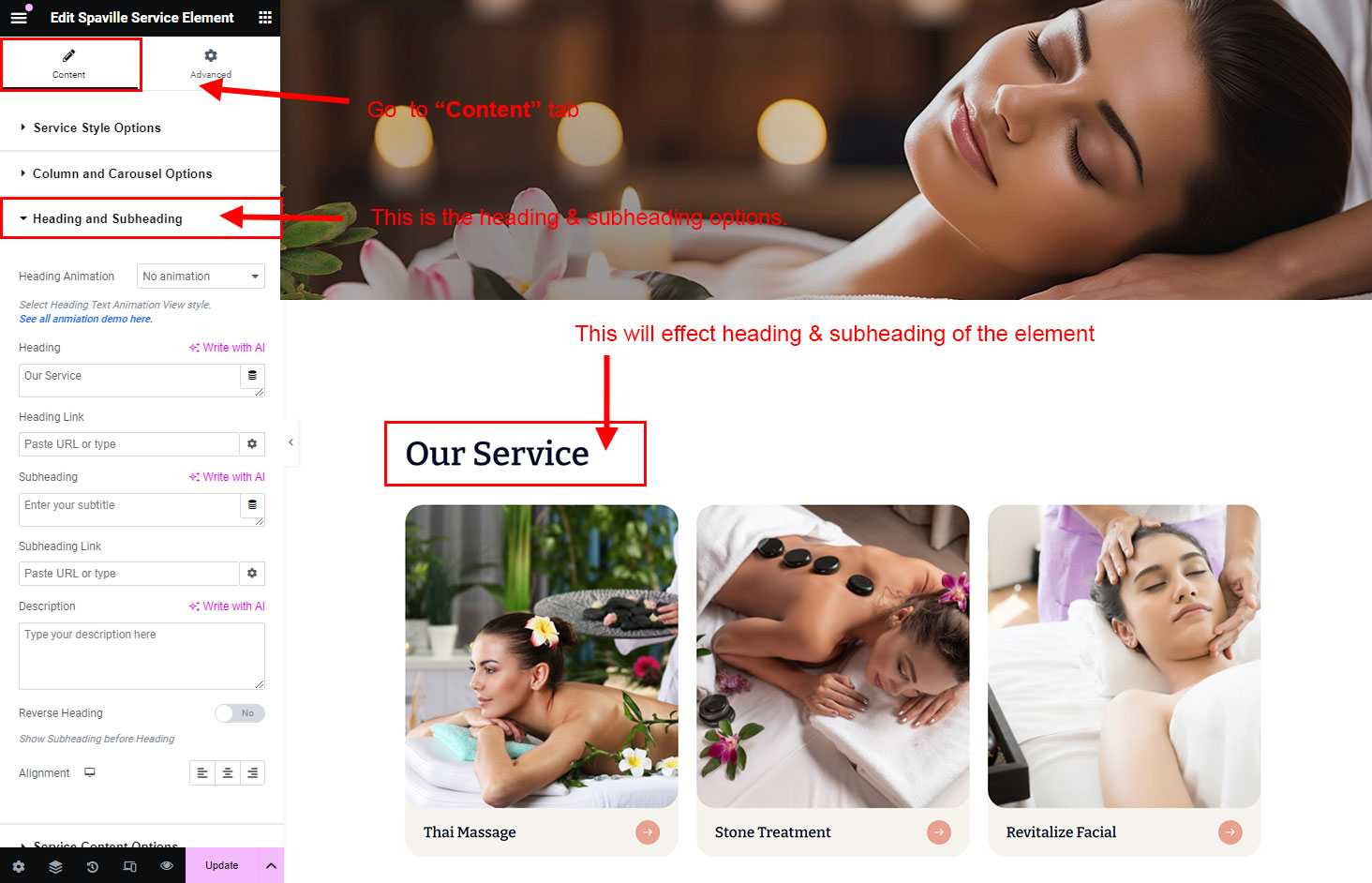 The heading and subheading will appear at top of the element. You can change text, add link to the heading or subheading, change alignment, change tag (for SEO purpose) etc.