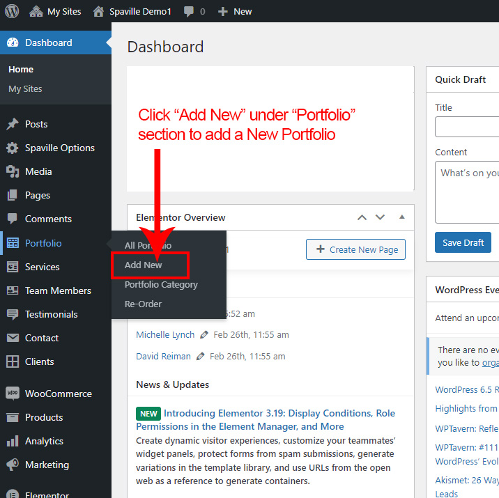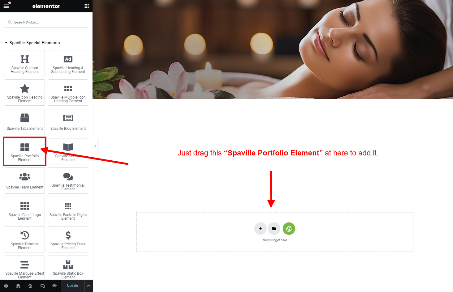 Now we have some Portfolio posts. So we can show all Portfolio on a page. Create a new page and add Spaville Portfolio Element on a page by dragging it.