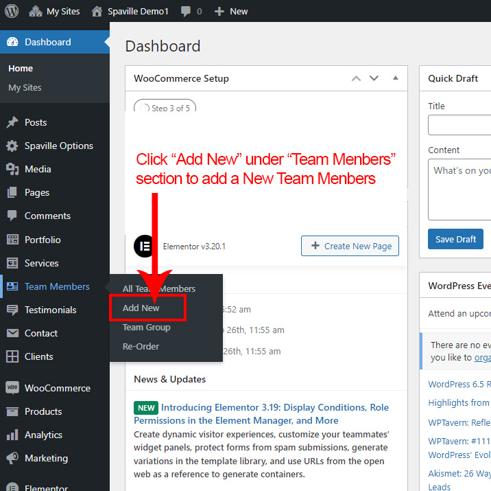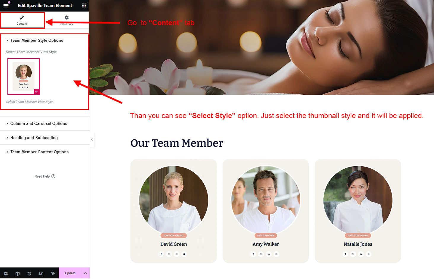 Now we have some Team posts. So we can show all Team on a page. Create a new page and add Spaville Team Member Element on a page by dragging it.