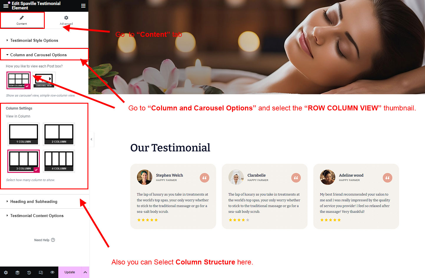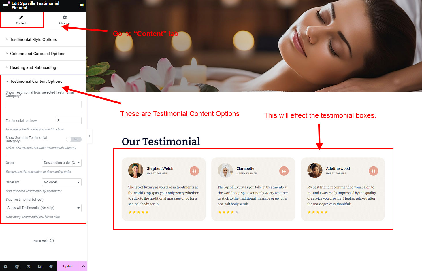 You can select the testimonial options here. Like how many testimonial you like to show, show testimonial from selected group (category), testimonial order etc.
