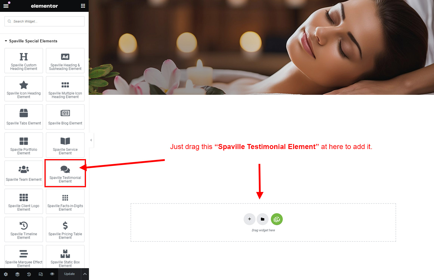 Now we have some Testimonial posts. So we can show all Testimonial on a page. Create a new page and add Spaville Testimonial Element on a page by dragging it.